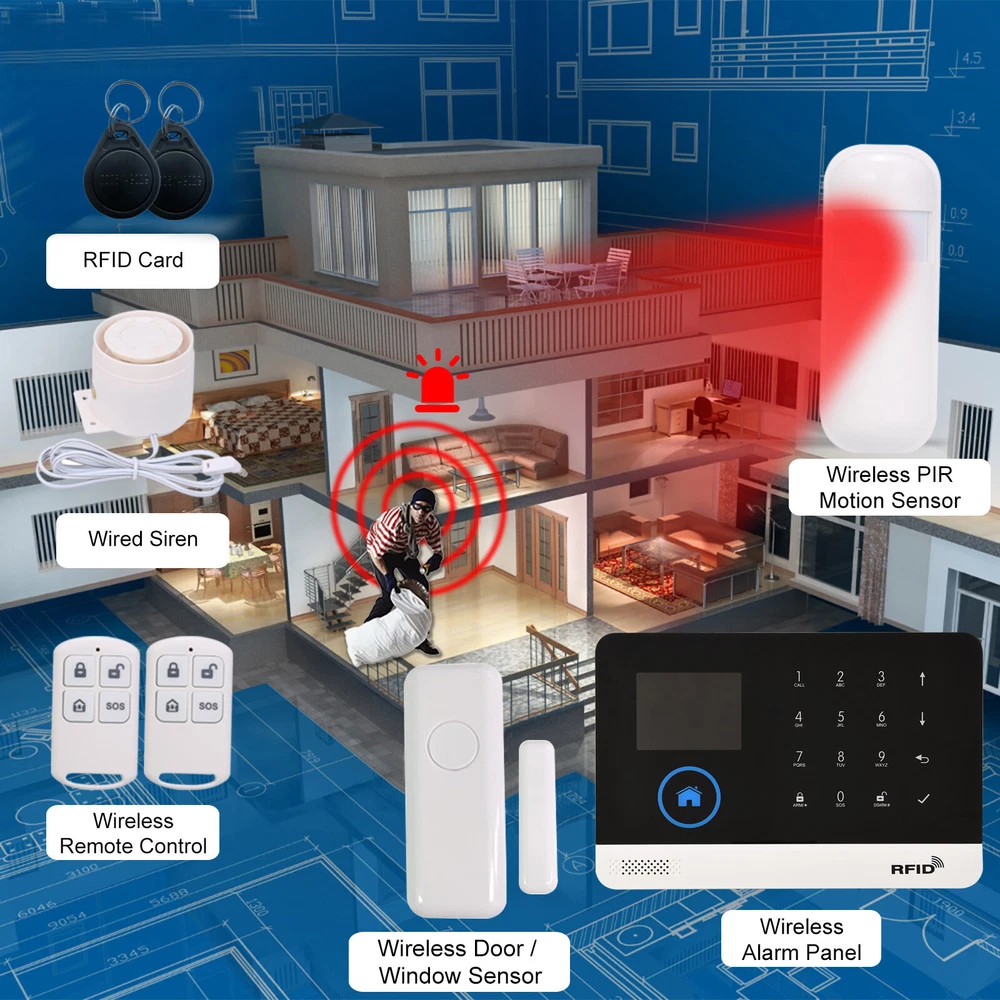 Overview: This alarm system contains a WIFI+GSM alarm panel, a PIR sensor, five door sensor, a wired siren, two RFID cards and two remote controllers. It supports for Alexa/ Home Voice Control and phone APP remote control. You can arm/disarm this alarm system via host, phone or remote controller. Advanced home automation functions for perfect smart home life. When the thief came in, the alarm will send out 110Db warnings to scare away the thief, or it will make auto-dial or send a message to remind you, so that it can help you reduce property loss and guarantee your home security. Features: 【Advanced TFT LCD Screen Display and Voice Prompt】: The Tuya Standard Alarm Security System features a high-quality 2.4" TFT LCD screen display, providing clear visuals and intuitive operation. The voice prompt guides users through every step, ensuring easy setup and usage. 【Comprehensive Remote Control Via Phone App】: This alarm system supports both WIFI and GSM connection, allowing users to easily control and monitor their home security from anywhere using the dedicated phone app. With just a few taps on your smartphone, you can remotely arm/disarm the system, adjust parameters, and manage accessories. 【Multiple Defense Zones and Flexible Arming Options】: With support for up to 100 wireless defense zones, including RFID cards and wireless detectors, this Smart Home Burglar Security Alarm System offers comprehensive conservation for your premises. It provides various arming modes, such as away arm, home arm, remote control arm, and remote telephone arm, giving you the flexibility to customize your security preferences. 【Enhanced Compatibility and Integration】: In addition to its standalone functionality, this alarm system is compatible with Alexa, Home, and IP cameras, enabling seamless integration into your smart home ecosystem. You can easily monitor your baby or elderly family members with the integrated IP camera feature and enjoy the convenience of voice control through your preferred smart assistant. 【Reliable and Convenient Features】: The Tuya Alarm Security System comes with several reliable and convenient features. These include SMS and dialing alarm notifications, support for 5 groups of preset alarm phone numbers, and timing arm and disarm functions. The system also includes a built-in lithium rechargeable battery to ensure continuous operation even during power outages. Additionally, the system supports daily operation and alarm record storage, as well as a 20-second voice message recording capability and an emergency SOS button for immediate help. Specifications: Power Adapter: DC 5V/1A (included) Working Current: <120mA Standby Current: <80uA Wireless Frequency: 433MHz Encoded Mode: 1527 Wireless Standard: IEEE802.11b/g/n 2.4G Alarm Panel Battery: Li-ion DC 3.7V 500mAh (Included) PIR Sensor Battery: 3*AAA 1.5V (Included) Door Sensor Battery: 1*CR2450 3V (Included) Remote Control Battery: 2*CR2025 3V (Included) Siren Volume: 110dB Temperature Range: 0℃~55℃ Humidity Range: <80% RH (No freezing) Item Size: Approx. 18.5*12.5*1.2cm/7.28*4.92*0.47in Item Weight: Approx. 226g/7.97oz Package Size: Approx. 21.5*15*7.5cm/8.5*5.9*2.9in Package Weight: Approx. 516g/22oz RFID up to 10PCS Package List: 1 * Wireless Alarm Panel 2 * Wireless PIR Motion Sensor 5 * Wireless Door/Window Sensor 2 * Remote Controller 5 * RFID Card 1 * Wired Siren 1 * Bracket for PIR Sensor 1 * Set of Mounting Screws 1 * USB Charging Cable 1 * User Manual (English) All loved it , you must satisfied!