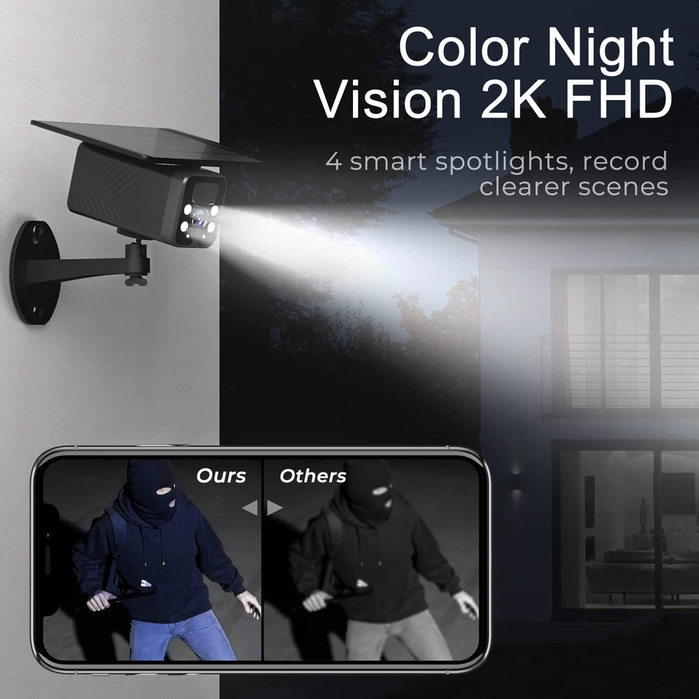 New upgrade 2K & Color Night Vision: 2K Full HD, equipped with an enhanced CMOS image sensor, which provides crystal images and videos, works with four equipped ultra-bright white LED lights, this surveillance camera can capturing clear color videos up to 33 feet at night and 120° wide field of vision, just like during the day, never worry about videos are not bright or clear enough. Smart PIR Motion Detection & Instant Alerts: PIR Motion Detection will sound an alarm to alert and start recording when someone is on camera, meanwhile, your phone will receive a notification. The advanced analysis technology to reduce false alarms, you can also set it to off. (It only records when it detects motions, not support 24/7 all day recording) Solar Powered & No Need To Charge: Built-in upgrade precise solar panel, has a strong ability to absorb sunlight, solar security outdoor camera can fully self-charge within two hours in the direct sunlight, works with built-in 9600mAh batteries, this can last up to 30 continuous rainy days once fully self-charge, you never need to take it down to charge. IP67 Waterproof & 1-Year Warranty: wifi camera was designed specifically for outdoor use, can overcome any harsh weather, the surface of the outdoor wireless camera is well sealed, adopts very precise waterproof tech, even if immersed in water for five minutes, the water will not seep into the device; The best use temperatures are between -13°F to 140°F (-25°C to 60°C). Amazon 365-day free return. 2-Way Audio & Cloud/SD Storage: home security system guarantees the built-in microphone and speaker enable a very high-fidelity conversation between the phone and the camera; Cloud/SD storage allows you to store large amounts of video data. (Support 30-day free cloud storage)