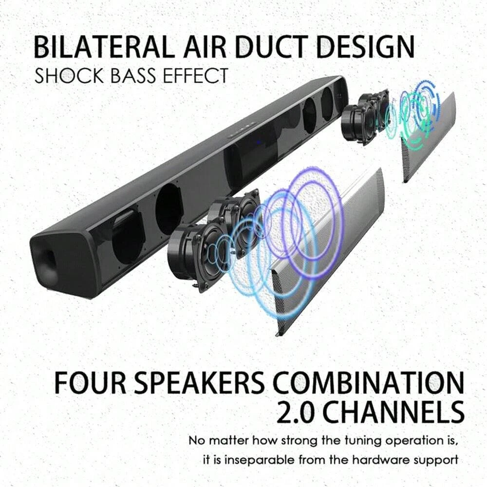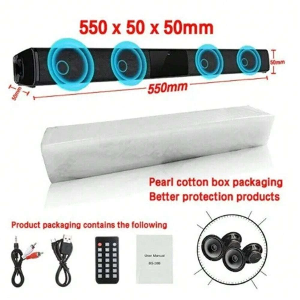Description: 1 .Upgraded deluxe stereo, 4 speakers, 3D stereo surround sound, the effect is absolutely stunning. 2.This sound bar can be connected to smart de vices via wired/wireless mode, using USB-B interface for charging, 3.5mm audio cable for connecting to TV, suitable for various devices such as TV, PC, laptop and smart phone. The built-in 2000mAh lithium battery gets rid of trouble caused by wires, and you can move it where you want. 3.FM radio,Can enjoy music and the fun of FM radio. 4.With RCA cable, it can be directly connected to TV and computer. 5.Built-in DSP sound processor, the sound is clear and no noise. 6.Equipped with remote control, free choice of mode. 7.Simple connection and easy operation. Specification: Bluetooth version: V4.0 Battery type: 18650 polymer battery Battery capacity: 2000mA Use time: about 3.5 hours Output power: 4 ohm*5W Frequency response: 20Hz-20KHz Transmission frequency range: 2.402G-2.480G Signal to noise ratio: ±80db Transmission distance: 8-10m Charging type: microUSB 5V/1.5A Size: 550*50*50mm/approx.21.65*1.96*1.96 inch Package included: 1x Speaker 1x Remote Control 1xUSB Charging Cable 1xRCA Audio Cable 1x English Manual Please make sure to check which type of audio output port is on your TV before purchasing? 1. Currently, the commonly used audio output ports in the market include RCA, fiber optic, 3.5mm, coaxial, and HDMI 2. The interfaces that can be directly wired for the speaker of our product are: 3.5mm input and RCA input 3. A. If your TV's audio output port is 3.5mm and RCA interface, it can be directly wired for use B. If your TV's audio output port is not 3.5mm and RCA output, you need to purchase a coaxial to RCA converter by yourself (not included) C. If your TV supports Bluetooth function, open the TV Bluetooth settings and connect to wireless Bluetooth for pairing