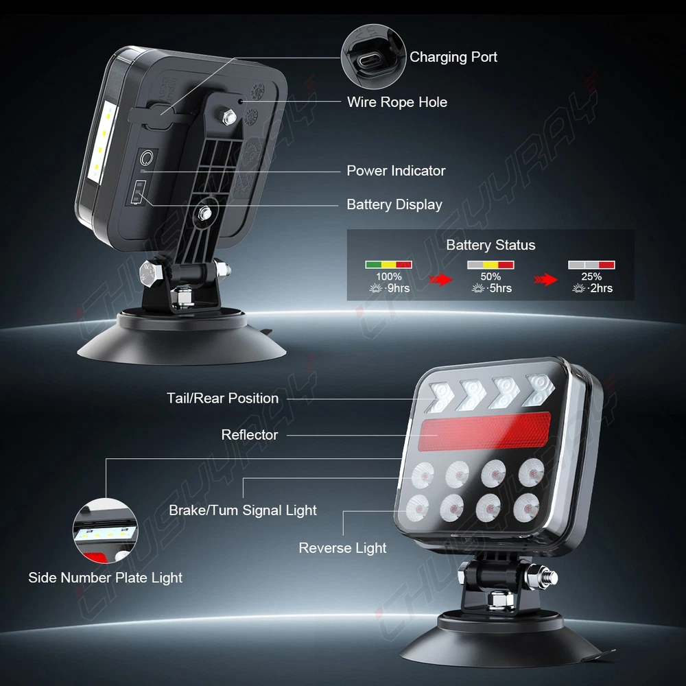 Experience next-generation towing safety with the USB-C Wireless Rechargeable Trailer Light Kit. Designed by a 15-member professional engineering team, this lighting system delivers exceptional performance through precise optical and structural research. Engineered for low energy use and high output, it offers a powerful combination of bright visibility, long runtime, and strong magnetic installation ideal for trucks, boats, RVs, and caravans. Features Stable Wireless Signals up to 100 Feet. Built-in antenna operates on a 2.4GHz frequency for uninterrupted signal transmission—ideal for extended towing setups. Adjustable Rubber-Coated Magnetic Mount. Easily installs on any metal surface like a truck bed or rooftop; holds securely even at speeds up to 50 mph. Fast USB-C Charging with Long Runtime. Charges in just 2.5 hours using the USB-C port and runs for up to 9 hours—no hardwiring required. Efficient and Ultra-Bright LED Output. Features ceramic base bulbs with enhanced heat dissipation, providing up to one mile of visibility and 60,000 hours of lifespan. Integrated Retroreflectors and Reverse Lights. Improve side and rear visibility from all angles while offering extra safety functions. Rugged IP67 Waterproof Design. Withstands temperatures from -40°F to 149°F, rain, and dust—ready for any environment. Engineered for Longevity and Reliability. Backed by a one-year warranty and expert support within 24 hours. Specifications: Charging Port: USB-C (DC 5V, 2000mA) Battery Capacity: 3.7–4.2V, 2600mAh Charging Time: Approx. 2.5 hours Runtime: Up to 9 hours Operating Temperature: -40°F to 149°F (-40°C to 65°C) Waterproof Rating: IP67 Material: ABS Base, PC Lens Visibility Range: Up to 1 mile LED Lifespan: Up to 60,000 hours Mount Type: Adjustable Magnetic Base Package Includes: 2 × Wireless Trailer Lights (Rechargeable) 1 × 7-Pin Round Signal Transmitter 1 × USB-C Charging Cable 1 × Car Charging Cable On Jan 21, 2026 at 01:07:32 PST, seller added the following information:
