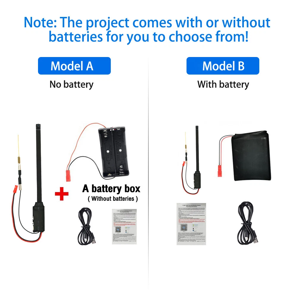 It is not allowed to use surveillance cameras to monitor and record others' privacy without their knowledge. Features: 【Small Camera】 This camera module is equipped with HD mini lens, fully meet DIY needs. This wireless camera can be used as a security camera to monitor your home or office. 【Micro SD Card Recording and Storage】 With this application, you can view videos directly and download them to your cell phone. You can also insert a micro SD card for loop recording or timing ( up to 128GB, not included ) . 【Motion Detection】 Features motion detection and smart alerts. When an object or person moves within the field of view, you will immediately receive a notification on your phone. It allows you to view events without delay and not miss any important moments. 【HD 1080P】 This WiFi camera is very easy to use for anyone. It has also been fully updated in terms of performance 4 megapixels, 1080P resolution, can be viewed remotely via wifi, more exciting for you to discover. 【Remote View】 Connect the mini camera to your router's WIFI and then you can access your camera unit remotely. By using the free camera app, you can view your house/kids/pets/babysitters from your cell phone anytime, anywhere. It allows you to live stream from anywhere to capture 1080P/30fps super clear pictures/videos of your home/office/store or anything you want to care about. Specification: *Product Name: WiFi Camera *Product Color: Black *Resolution: 1080P *Video format: AVI *Recording frame rate: 30fps *Lens Viewing Angle: 120° *Photo function: Support *Motion Detection: Support *Microphone: Built-in *Battery Life: Approx. 8 hours *Battery Capacity: 3000mAh *Charging port: micro USB *Support Network: 2.4Ghz Wi-Fi and Peer-to-Peer P2P ( 5G not supported ) *Maximum support: 128GB Micro SD card ( micro SD card not included ) *WiFi function: Yes, remote viewing via smartphone anytime, anywhere. *Supports simultaneous recording and loading. *Application: V380pro *Operating system: iphone or android phone Model A Packing list: 1*DIY camera 1*User manual 1*battery box 1*micro USB cable Model B Packing list: 1*DIY camera 1*User Manual 1*Polymer Battery 1*micro USB cable Attention: 1. Item has with battery and without battery for your choice! 2. item does not include micro SD card, need to buy extra! 3. Please allow 1-2cm error due to manual measurement, make sure you don't mind before ordering! On Dec 18, 2024 at 17:50:48 PST, seller added the following information: