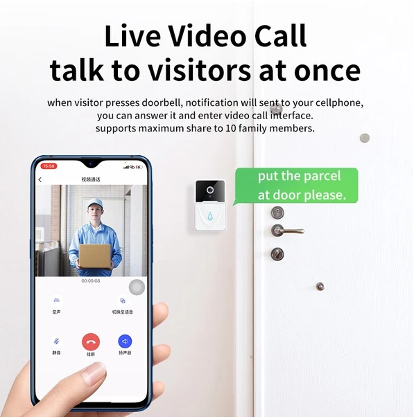Color White Material: ABS Type: Smart WiFi Doorbell - Two Way Talk - Night Vision - Chime - Video Main Control: XR872 Sensor: 30W GC0328 CMOS sensor Lens: 166 Wide-Angle Lens Signal-To-Noise ratio: 41dB Night Vision: 2 850nm 28mil high-power infrared lights; Battery Type/Capacity: Polymer 803035/1000MAH Battery Discharge Time: Polymer Battery Standby For 1 Year Network Protocol: TCP/IP/HTTP/TCP/UDP/DHCP/DNS/DDNS/NTP/RTP/P2P WiFi Connection: 2.4GHz WiFi, Support (802.11 b/g/n) Ding Dong: Support RF 433MHZ Ding Dong Working Voltage: Polymer 803035/3.7V