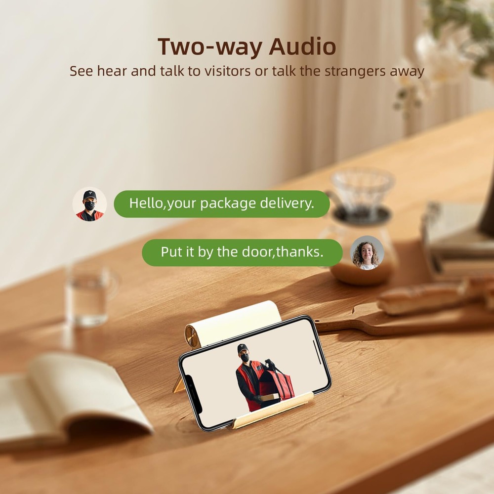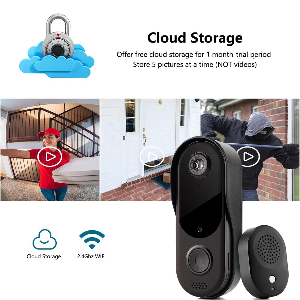 Doorbell Camera Wireless WiFi Video Doorbell with Chime, Two-Way Audio, HD Secur Features: Smart Doorbell - eudic doorbell camera has taking photo, two-way audio,cloud stroage,night vision,waterproof,share with your family,2.4GHZ WIFI to make your life more convenient.Note:NO Motion Dection,Night vision range is about 2 meters. Two-way Audio & Sharing - Video doorbell with a free chime provides you real-time clear two-way audio, you can see, hear and talk with the visitors immediately through APP. After visitor press doorbell,notification will sent to your cellphone, you can answer it and enter video call interface,supports maximum share to 10 family members. Cloud Storage - When visitors press the Doorbell. Mobile phone will receive Alert, you can see at the door through the APP any time. Don't miss any visitors .Cloud storage will store 5 pictures (NOT VIDEO) each time, free trial for 1 month. IP5 Waterproof & Energy Saving - IP5 dustproof and waterproof rating;You don't have to worry about battery life is too short because 2 battery(full charge can support 1-2 months use),more safer.Please fully charge the device before use. Easy to Install & 1 Years Warranty - 2.4GHZ wifi connection,use QR code to connect your phone in 1 minute without complicated connection steps .No need SD card required .Guaranteed 1 Years after-sales service to assure your long-term enjoyment.(Note : please try to keep the router close to the device.If 5G router is used, please select 2.4G channel) Features: Smart Doorbell - eudic doorbell camera has taking photo, two-way audio,cloud stroage,night vision,waterproof,share with your family,2.4GHZ WIFI to make your life more convenient.Note:NO Motion Dection,Night vision range is about 2 meters. Two-way Audio & Sharing - Video doorbell with a free chime provides you real-time clear two-way audio, you can see, hear and talk with the visitors immediately through APP. After visitor press doorbell,notification will sent to your cellphone, you can answer it and enter video call interface,supports maximum share to 10 family members. Cloud Storage - When visitors press the Doorbell. Mobile phone will receive Alert, you can see at the door through the APP any time. Don't miss any visitors .Cloud storage will store 5 pictures (NOT VIDEO) each time, free trial for 1 month. IP5 Waterproof & Energy Saving - IP5 dustproof and waterproof rating;You don't have to worry about battery life is too short because 2 battery(full charge can support 1-2 months use),more safer.Please fully charge the device before use. Easy to Install & 1 Years Warranty - 2.4GHZ wifi connection,use QR code to connect your phone in 1 minute without complicated connection steps .No need SD card required .Guaranteed 1 Years after-sales service to assure your long-term enjoyment.(Note : please try to keep the router close to the device.If 5G router is uséd, please select 2.4G channel) eBay integration by