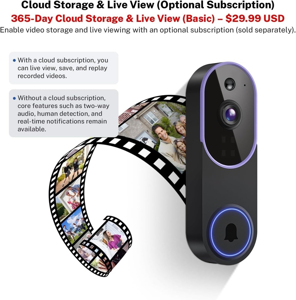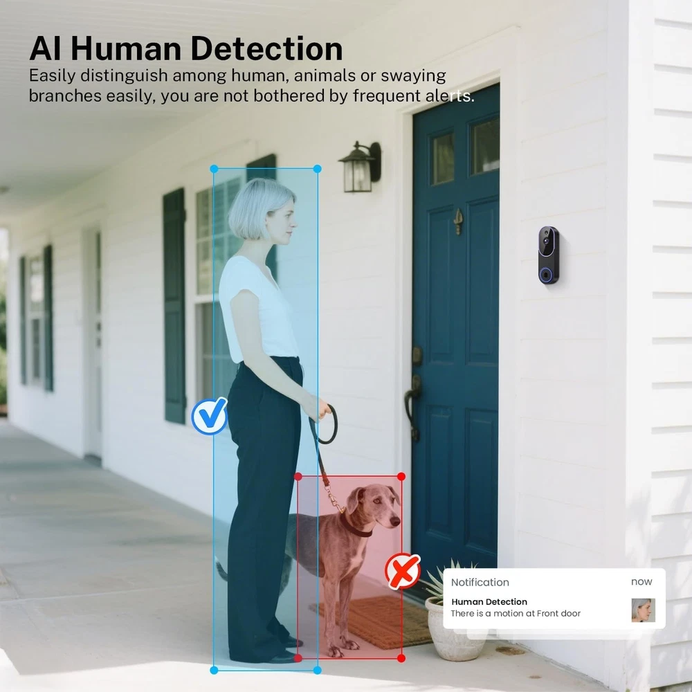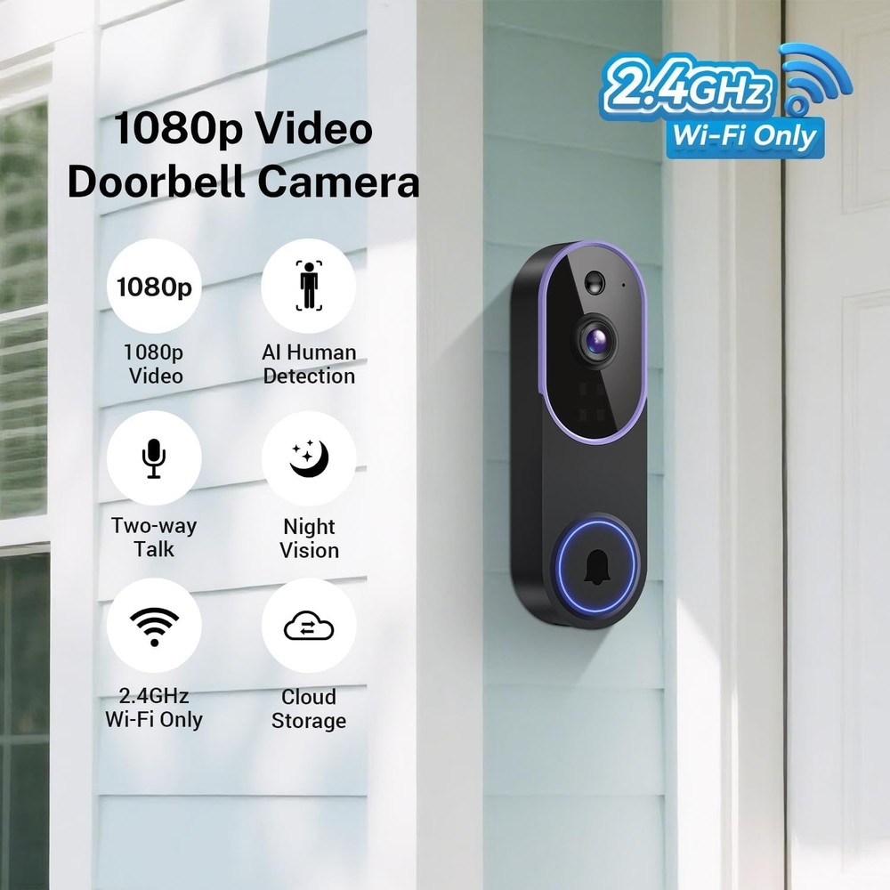 Wireless WiFi Video Doorbell Smart Phone Door Ring Intercom Security Camera Bell item description: Smart AI Recognition: Advanced algorithms detect human activity while filtering out pets and vehicles, so you only receive meaningful notifications. Clear Two-Way Audio: Communicate directly with visitors through built-in audio, whether you're at home or away. Secure Cloud Storage: Protect your recordings with AES-128 encrypted cloud storage, supporting live view, playback, and easy sharing of important footage. Receiver Alerts: The included indoor receiver can be placed in any room to suit your needs. Multiple receivers can be linked to a single doorbell for enhanced coverage. Stable 2.4GHz Wi-Fi: Optimized for 2.4GHz networks, this doorbell provides smooth, consistent performance at all times. (5GHz not supported.) High-Definition Night Vision: Four IR LEDs and an intelligent sensor capture clear, detailed video even in pitch-black conditions.