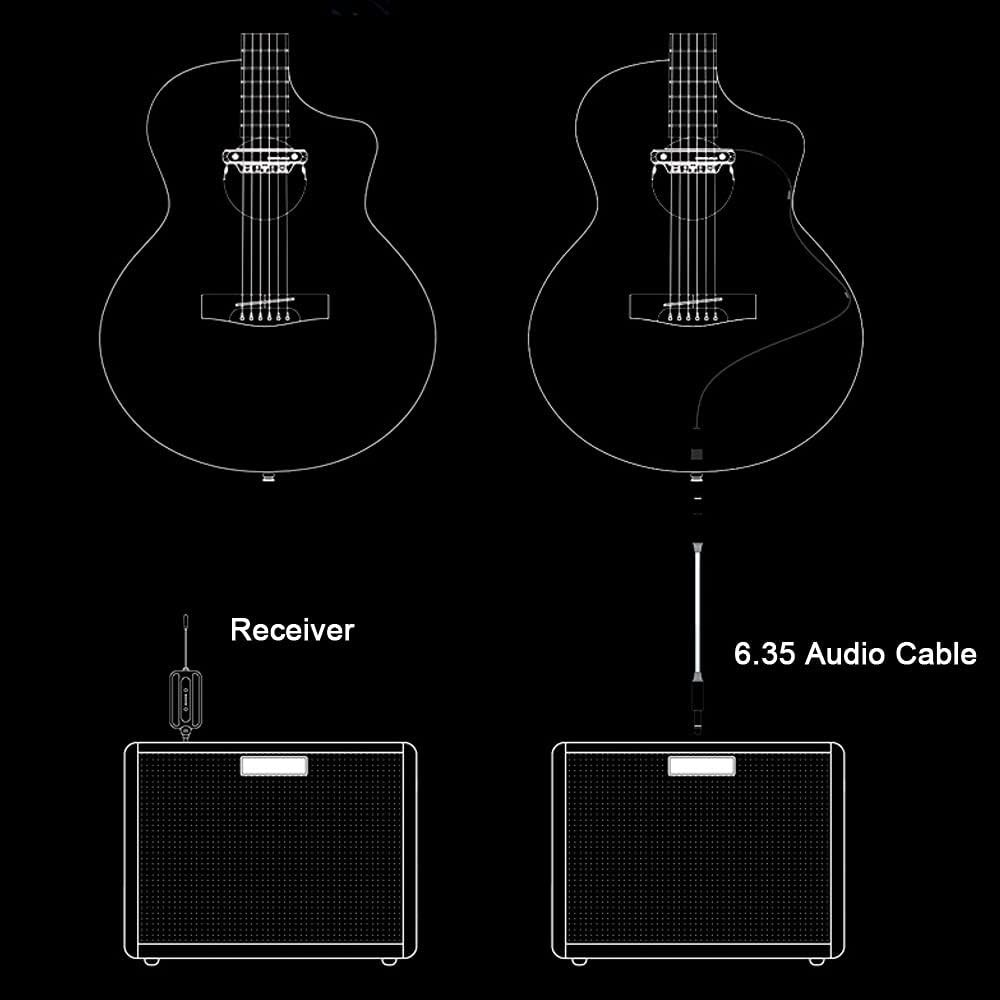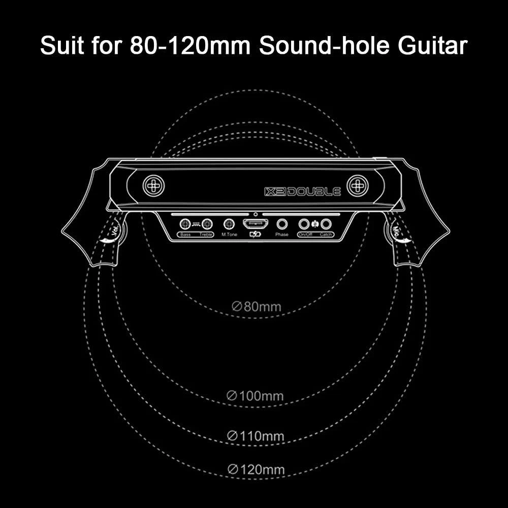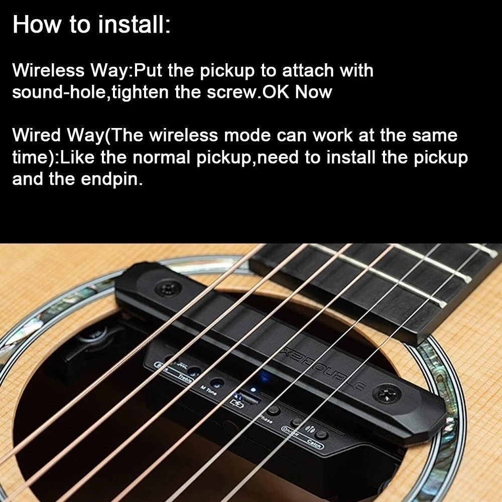 【Wireless Transmission Sound Hole Pickup】a wireless sound hole pickup system for acoustic guitars with 80mm-120mm hole sound. Equipped with an imported microphone, the volume can be adjusted independently, and it supports picking up techniques such as board hitting, AM, PM, and slapping. The details are clear, and it is more compatible with playing and singing without grabbing the human voice. 【Dual Working Mode】wireless/wired mode; X2 pickup is a set of wireless pickups, the pickup has a built-in transmitter and is equipped with a Receiver wireless receiver. At the same time, the system the function of wired output is still retained. 【Dual-system Pickups】The new generation of RX dual-coil technology is blessed, which greatly increases the dynamics and layering of the sound. The magnetic force absorbs the vibration of the strings, and the microphone absorbs the sound of the guitar. 【Long-lasting Working Time】Built-in rechargeable lithium battery, the use time (receiver) 8 hours after fully charged, and comes with a USB charging cable. You can enjoy your performance without any worries. 【Improve Your Stage Performance】Designed for scenes, bars and small concert halls. X2 sound hole pickup with microphone receiver 30M wireless transmission, suitable for 80-120 mm sound hole acoustic guitar pickup. The Wireless & Wired Acoustic Guitar Pickup System is a versatile and high-quality solution for guitarists looking to amplify their acoustic guitars. The active soundhole pickup in black color is designed to fit acoustic guitars perfectly, providing clear and natural sound reproduction. With both wireless and wired capabilities, this system allows for convenient and flexible performance options. Made in the United States, this pickup system offers exceptional quality and reliability for musicians.