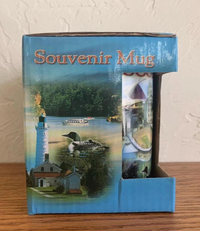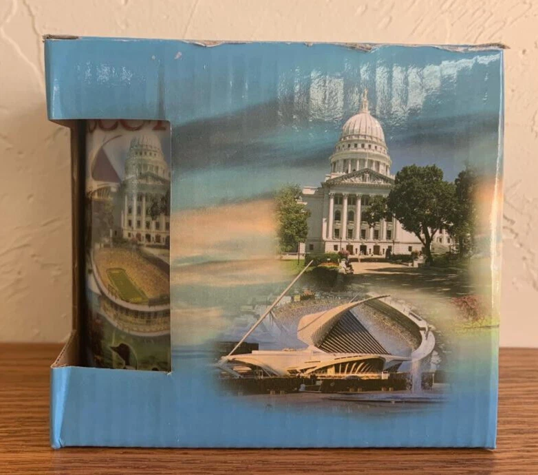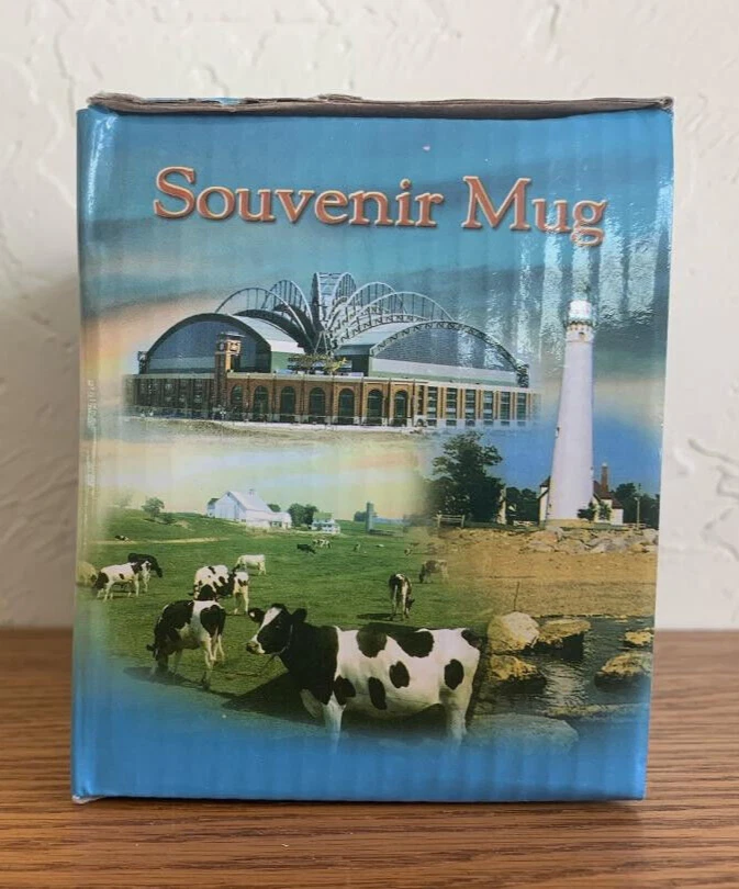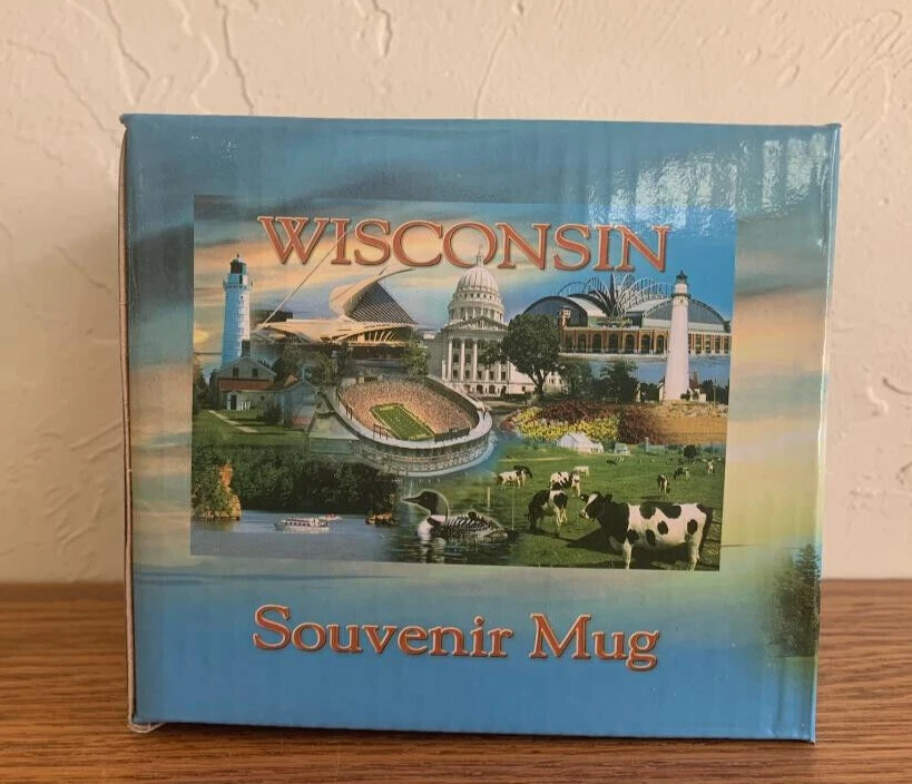 This Souvenir mug features a multi-color design inspired by iconic images from the State of Wisconsin including Lambeau Field, American Field, Lighthouses, Cows and many others. 3 1/4" Wide Rim, 3 3/4" Tall Brand new from our gift shop located in Green Bay, WI. Check out our other listings. We can combine shipping.