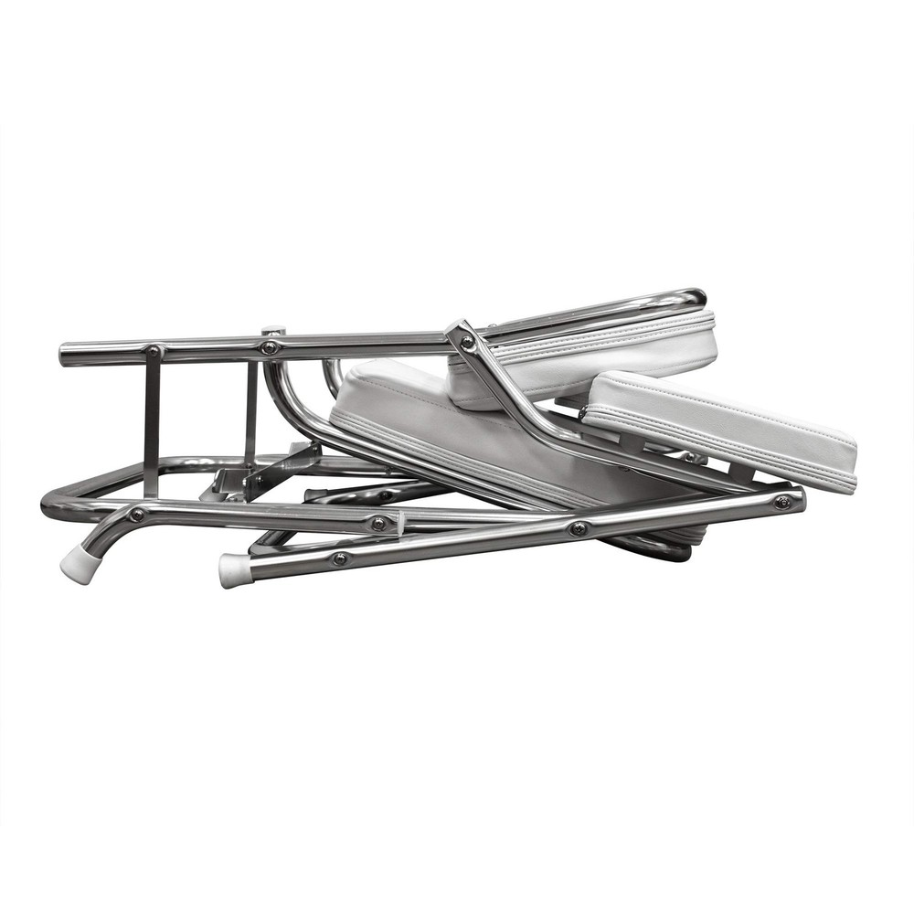Comfortable folding chair is ideal for boat decks, docks and patios - folds easily to stow away when not in use Durable reinforced anodized aluminum frame engineered for the harsh offshore marine environment, with composite leg tips to protect deck surfaces Injection molded high impact plastic seat base and back rest frame with high compression foam padding for maximum comfort Heavy-duty 28 oz marine grade vinyl, double top stitch construction detail. Withstands the effects of sun, heat, rain and soiling under normal conditions Seat Dimensions - Height: 31", Width: 25", Depth: 23", Seating Depth: 16"