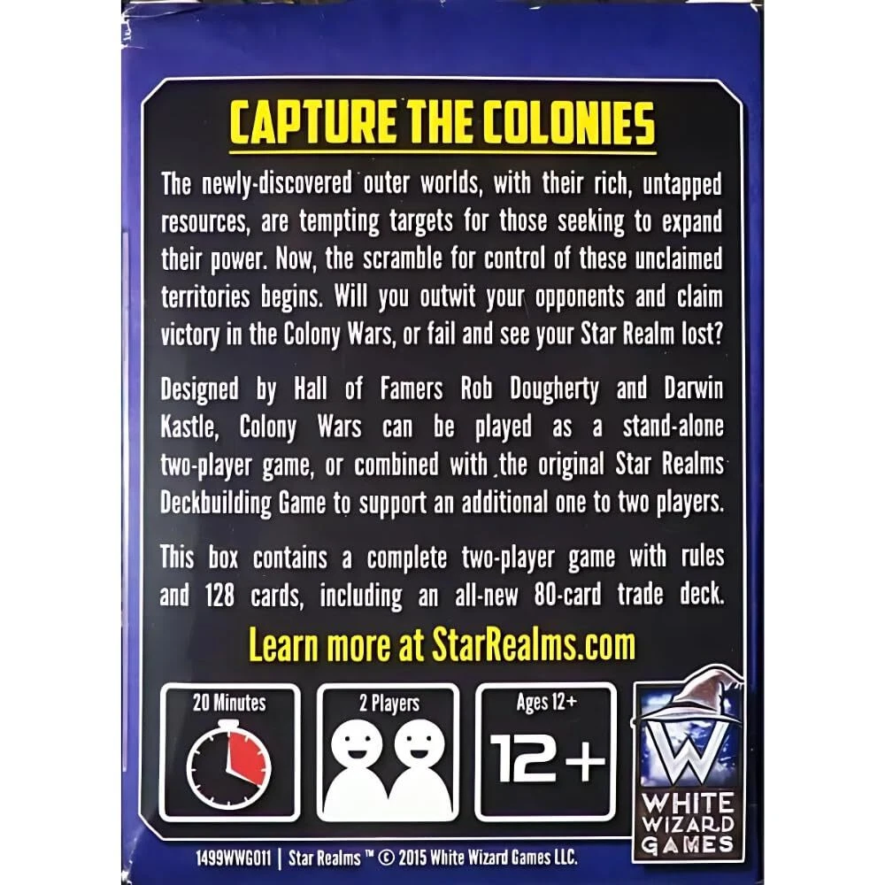 Colony Wars is a stand-alone expansion for the hit Star Realms deckbuilding game. Colony Wars can be played as a stand-alone 2 player game or combined with the original Star Realms Deckbuilding Game to support an additional 1-2 players. This box contains a complete 2 player game with rules and 128 cards, including an all new 80 card track deck.