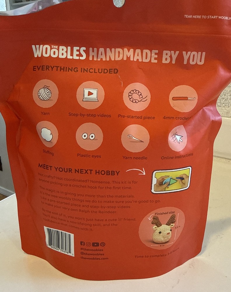 The Wobbles Crochet Kit Ralph the Reindeer is a beginner-friendly craft kit that includes everything needed to create a charming crocheted reindeer. This kit is specifically designed by The Woobles brand and includes one unit of materials. Perfect for those interested in needlecrafts and yarn, this kit is a fun and creative way to get started in the world of crocheting and knitting.