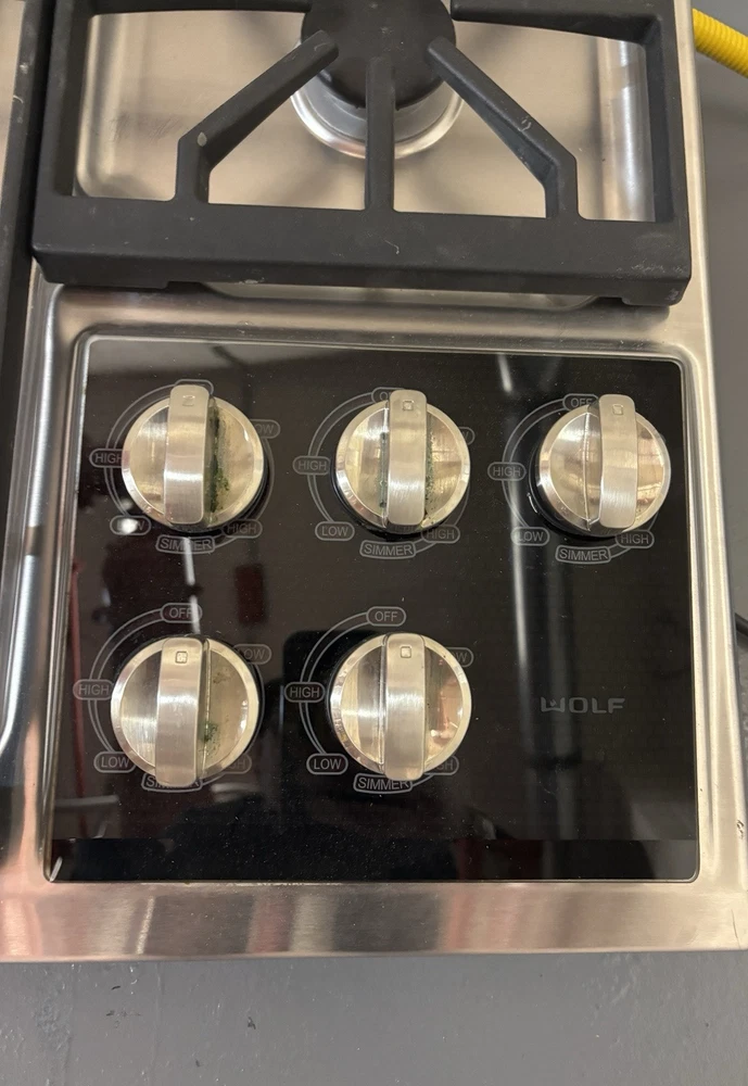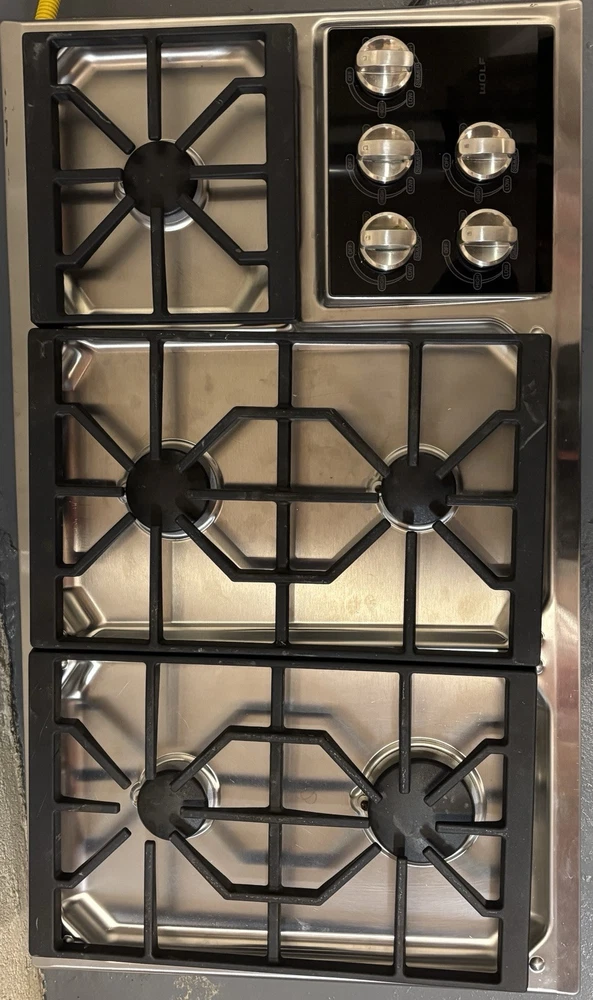 The Wolf 5 Burner Range is a drop-in cooktop with a stainless finish. It runs on natural gas and is suitable for cooking. The set includes the burner unit. This appliance is designed by Wolf, a reputable brand known for high-quality kitchen equipment.