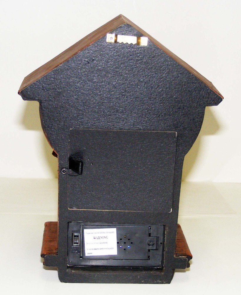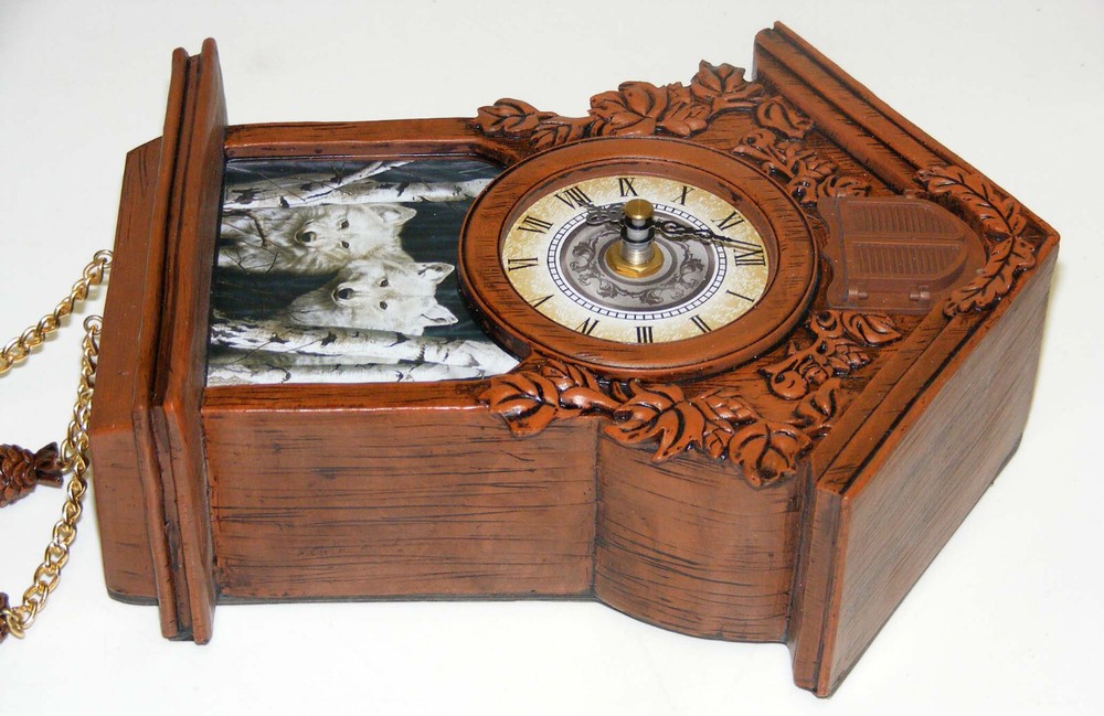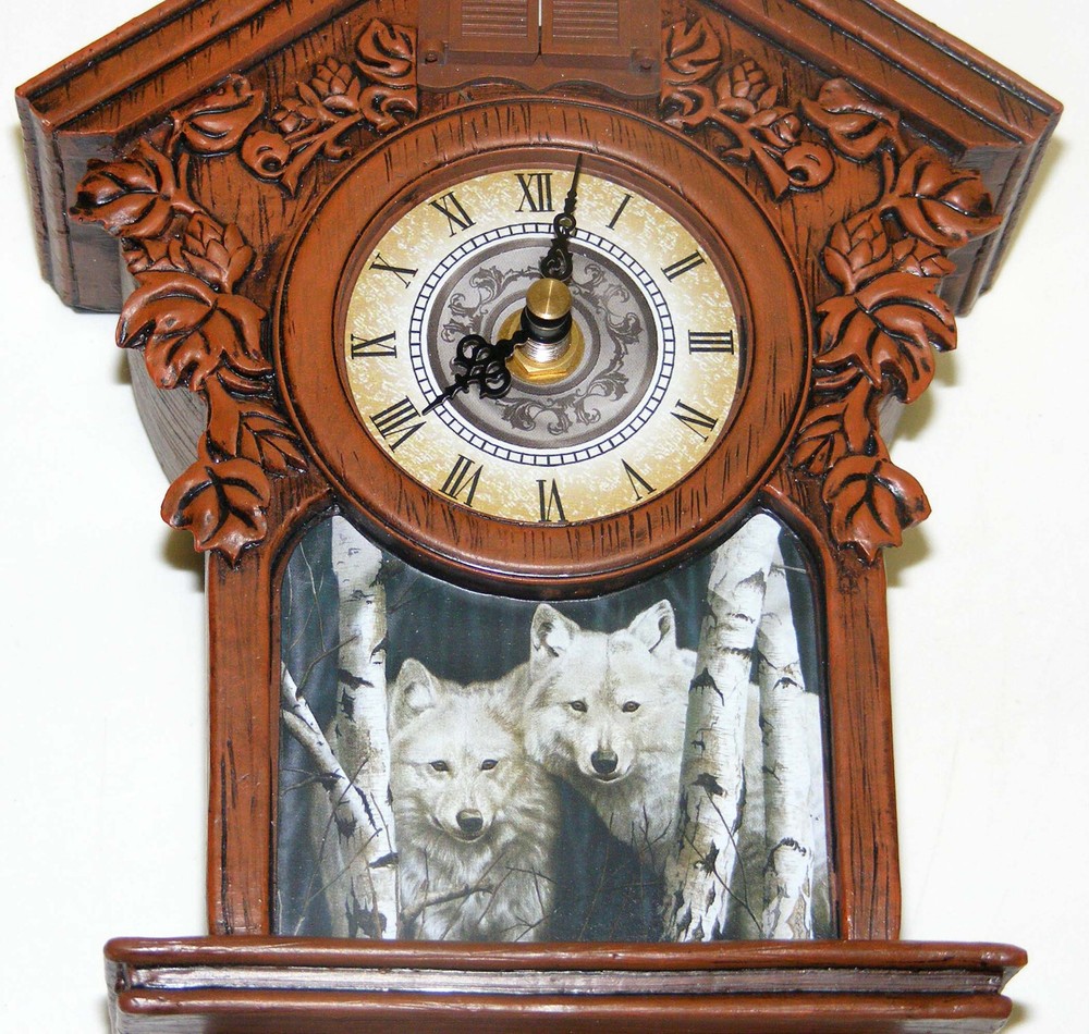 From a recent estate we offer this fabulous coo-coo clock. We inserted a new battery (not included), have let it run about 2 weeks and it has worked perfectly. It's in wonderful condition; the little bird pops out and chirps regularly and it has kept great time. We didn't have a place to hang it so we took photos while it was laying down. Then we found the clock online - the first photo is borrowed to show how it looks when hanging. Following is additional information we found about this clock: "Wildlife artist Rusty Frentner is renowned by collectors for his stunning portraits of majestic wolves. Now you can enjoy his artistry in a brand-new way, in this striking wolf art cuckoo clock graced with a breathtaking portrait of two white wolves! You're sure to be captivated by this acclaimed artist's magnificent artwork, showcased on the front of this beautiful timepiece. This ONE-OF-A-KIND wolf art cuckoo clock is the perfect addition to any decor and is available exclusively from The Bradford Exchange. Handcrafted of wood and embellished with sculpted artist's resin details, this precision timepiece features an accurate quartz movement, traditional hands and Roman numerals. A red oak- colored finish and decorative brass-toned pine cones add to the cuckoo clock's flair. Plus, at the top of each hour, the doors above the clock's face open to reveal a sculptural cuckoo that chirps to announce the hour!" b32