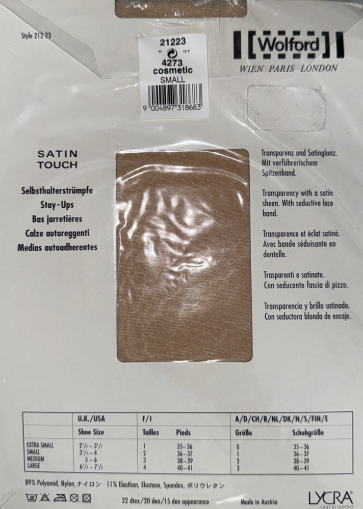 Wolford Satin Touch Thigh Highs Stay-ups Hold-ups These classic stay-ups are sort of the Goldilocks of thigh-high stockings. The number in the name of Wolford stockings refers to the denier (the fancy french word for "thread count"), so these 20's are sheer enough to show off your pins but with tensile strength that stands up to the underside of desks etc. The wide band of gorgeous no-dig stretch lace at the stay-up band is fitted with bands of no-slip silicon to stay put and sandal toe is almost invisibly reinforced. Truly stunning and "just right". WOLFORD Stock Location #21223-15 DIN 20260129 Commitment We are committed to making sure that you leave this transaction satisfied. That means having access to real people that get your questions and concerns answered quickly. Give us a shot and we will make sure that you will look to us again! Quality Products Have peace of mind knowing that we offer the highest quality and most products will arrive in their original factory sealed packaging. Items are stored and shipped from a Smoke Free Environment . Fast Shipping You're already purchasing the item. We get your order shipped out and delivered to your doorstep as quickly as possible.