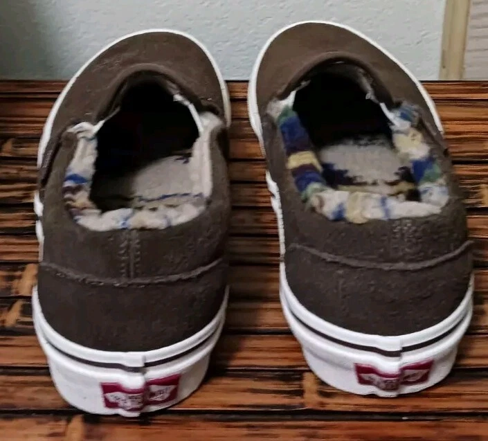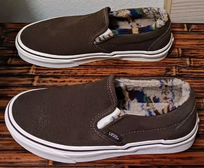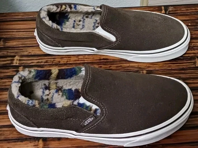 This woman's Vans Classic Slip-On sneaker in size 7 features a chocolate brown suede upper with an Aztec-inspired design. The slip-on style makes it easy to wear, and it is lined with cozy faux fur for added comfort. Perfect for casual, activewear, or workwear occasions, this shoe is suitable for activities like walking, school, and skateboarding. With a retro and colorful theme, this Vans model offers a classic and stylish option for women looking for both fashion and functionality in their footwear.