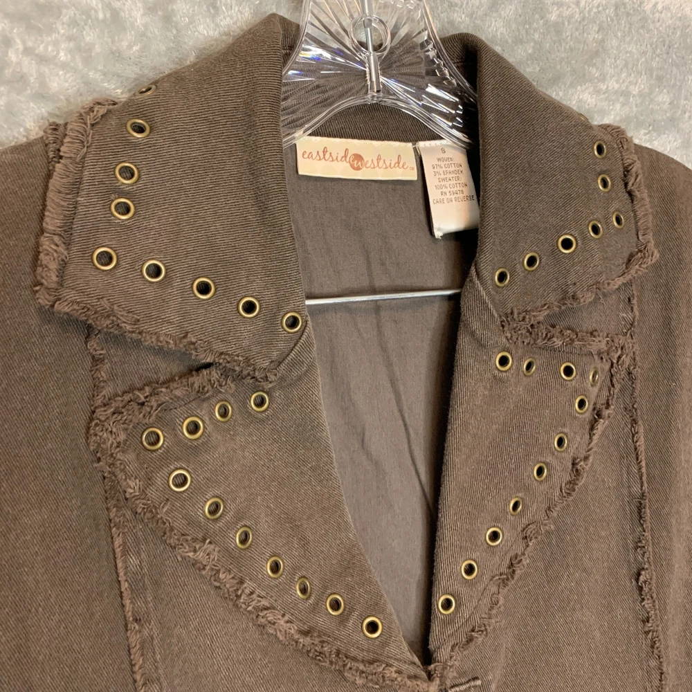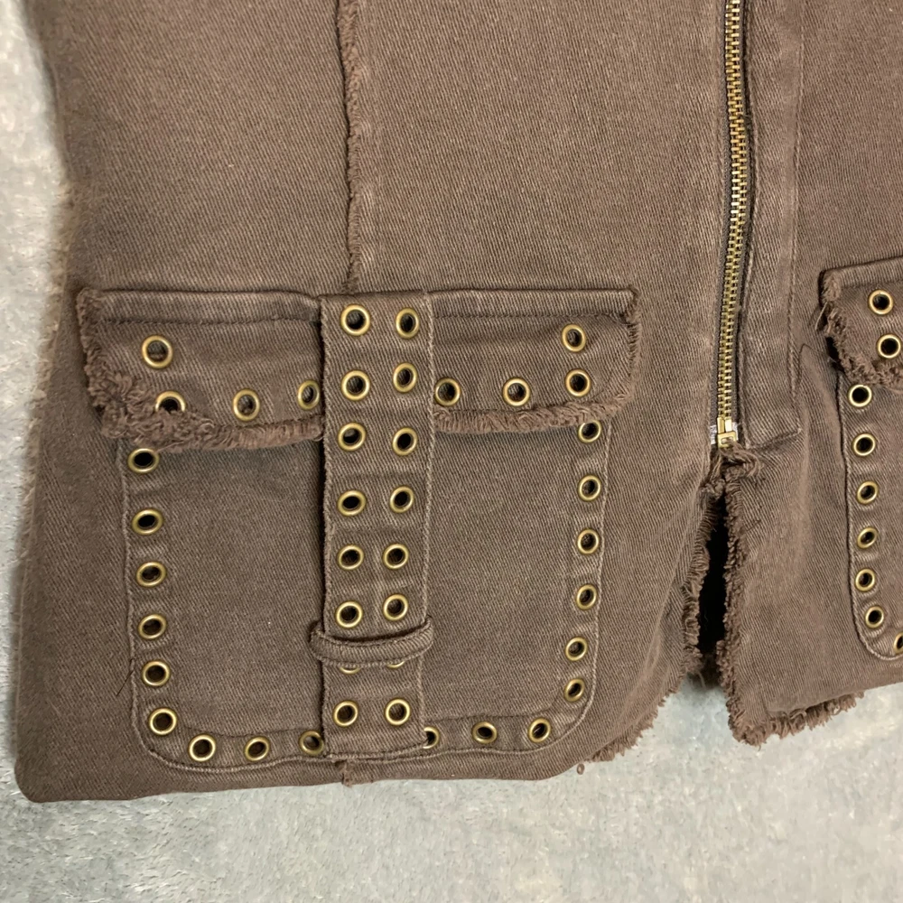 Good Pre Owned condition. Please see photos for details. SUPER FAST SHIPPING!!! We ship next business day! If you aren't happy with your purchase we offer 30 day FREE returns. No questions asked! Women 90s Y2K Streetwear Hip Hop Raw Hem Ring Studded Zip Up Brown Denim Vest S