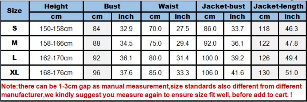 Please Read Carefully Before Your Purchase! Color may vary slightly due to the lighting & the flash used in the photography or the setting of computer monitors. Please note that the photos below do not show actual size and please pay fully attention to the description for size details.The measuring of size and length are hand measurement,so it may occurs discrepancy sometimes but usually very close.Thank you! Size Data P.S : full set include jacket+shirt+skirt+belt , well packed. Photo Show: Tariff Delivery details Feedback Return /Refund Contact us Tariff Paying tax is the duty of every citizen, buyer need to responsible for the all of taxes. Due to the tax problem, buyer refuse to receive the goods, buyer need to Responsible for freight out and home. Delivery details 1. Delivery time: We send by China Post Air Mail in Default. (20-60 days for different cournties, Brazil sometimes needs 90days). We send by Epacket to USA about 7-15 days. 2. For fast delivery, please choose EMS (7-10 days), for Russia and Brazil, it needs 10-15 work days. 3. We guarantee to ship out within 15days after payment confirmation (except Holiday). 4. Our shipping rates include the cost of shipping, handling, packaging and related manpower costs. 5. Please contact us If you don't receive over above business days,we will solve this problem in a very short time. 6. Please make sure the shipping address is correct. We are not responsible for any wrong or undeliverable addresses. Feedback 1.We depend on our aliexpress reputation and customer satisfaction to succeed. Therefore, Your feedback and DSRS are extremely important to us as better DSR scores affect our search; placement on aliexpress. 2.If you love my items please leave me good feedback and 5 star DSR rating. Your action will help us offer our milk and bread . I will do the same for you .If we have not given you reason enough for 5-star grades on each DSR then please let us know how we can earn your 5-star rating before submitting your stores! Return /Refund 1. We will check the goods quality before shipment. If there are some unexpected problems happen, we hope to solve the problems with buyer through friendly in the following ways: (1) If it is quality problem, buyer can contact us after receiving the goods, buyer can help to provide photos or video and other evidence to help us to solve the problems. (2) Man-made damaged, buyers take full responsibility. (3) If the cusomers do not satisfy with the products, the buyer return the goods in original conditon to us; after we receive the goods ,we will send a new product to buyer or refund the money. But shipping fee is not refundable. And the item should be returned to us in its original condition by mail with tracking number. 4. Any question you would like to ask ,welcome to email us Contact us All emails will be answered within 24 hours. If you do not receive our reply, please kindly re-sent your email and we will reply you as soon as possible. If you email us and don't hear a reply, please email again through the aliexpress system as sometimes our mail servers have errors Because of the new rule of Russia post office, When make an order, Russia customers have to write the Full name(a surname, a name and a middle name), or the packages would be sent back . No full name, we will refuse to send goods out! thanks! Thank you for your coming to our shop!!!