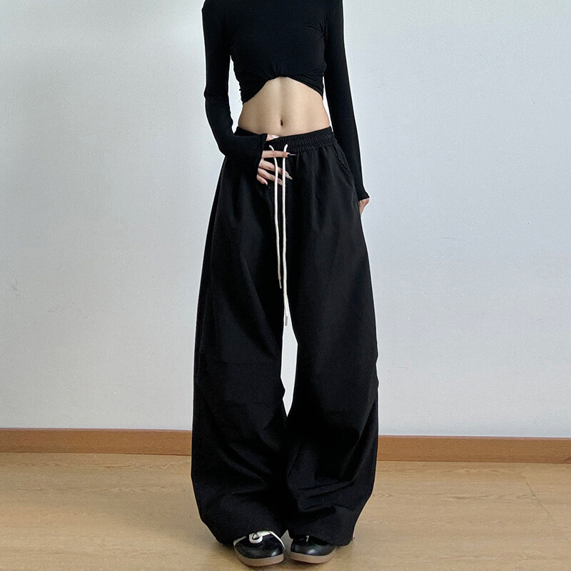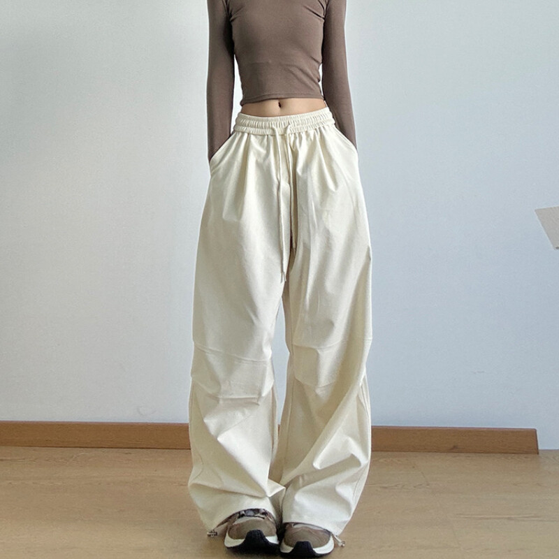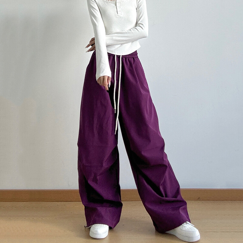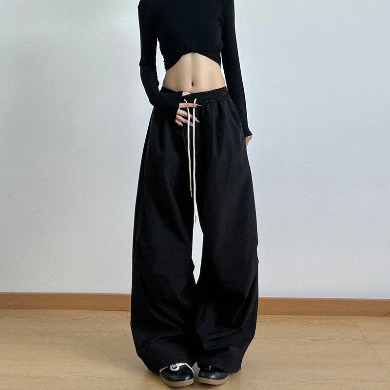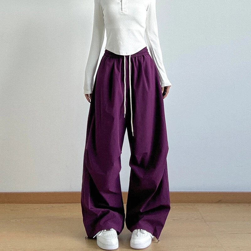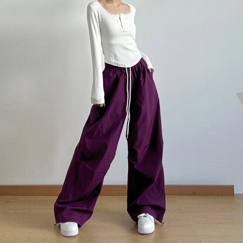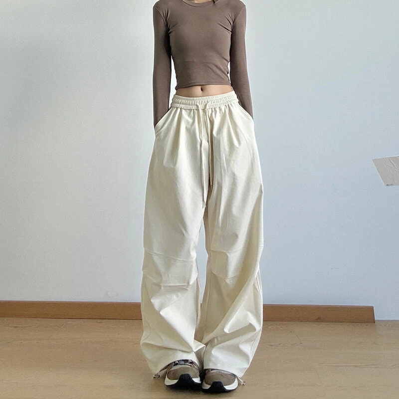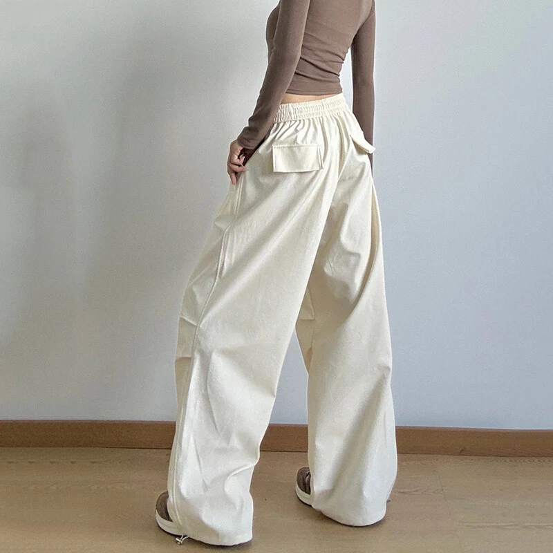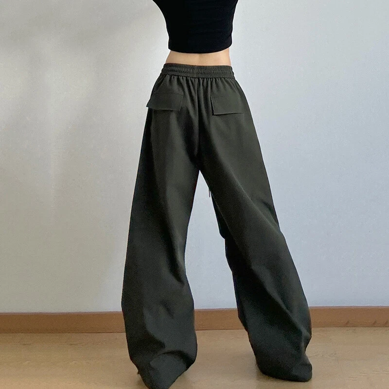 Women Casual Wide Cargo Pants Hip Hop Elastic Waist Straight Leg Pants