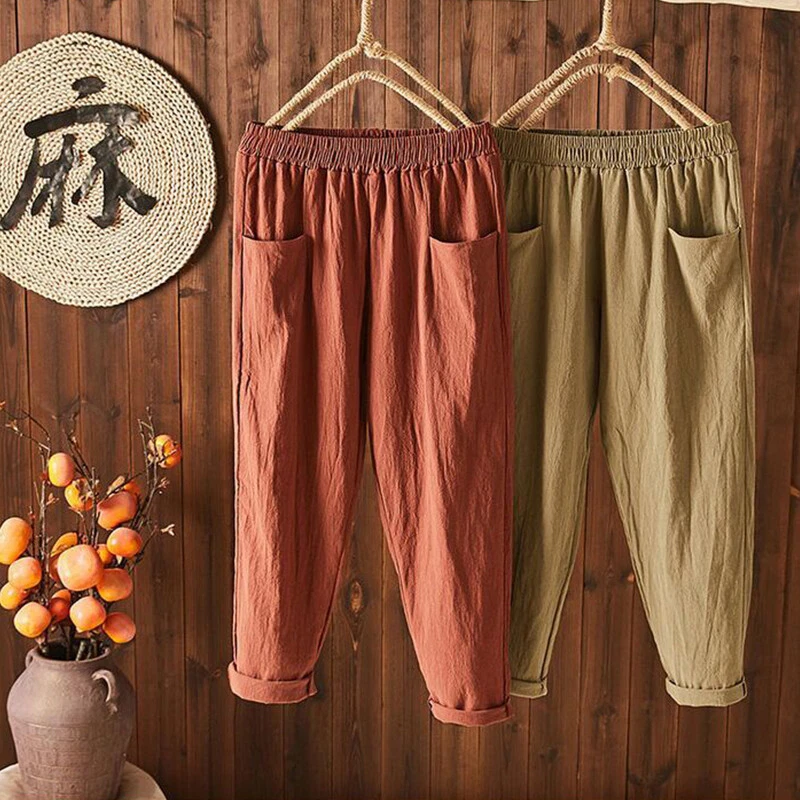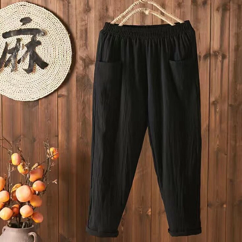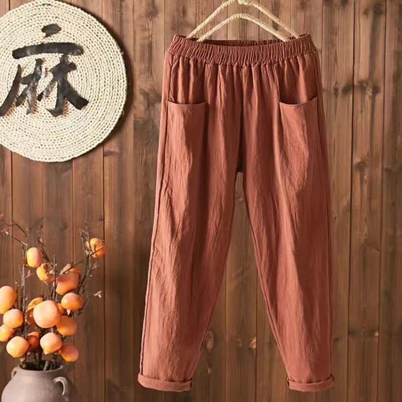 ❀Women Elastic Waist Cotton Linen Harem Pants Ladies Casual Baggy Solid Trousers