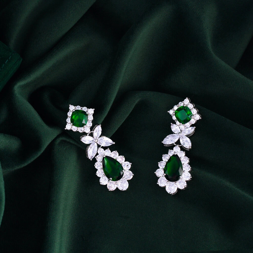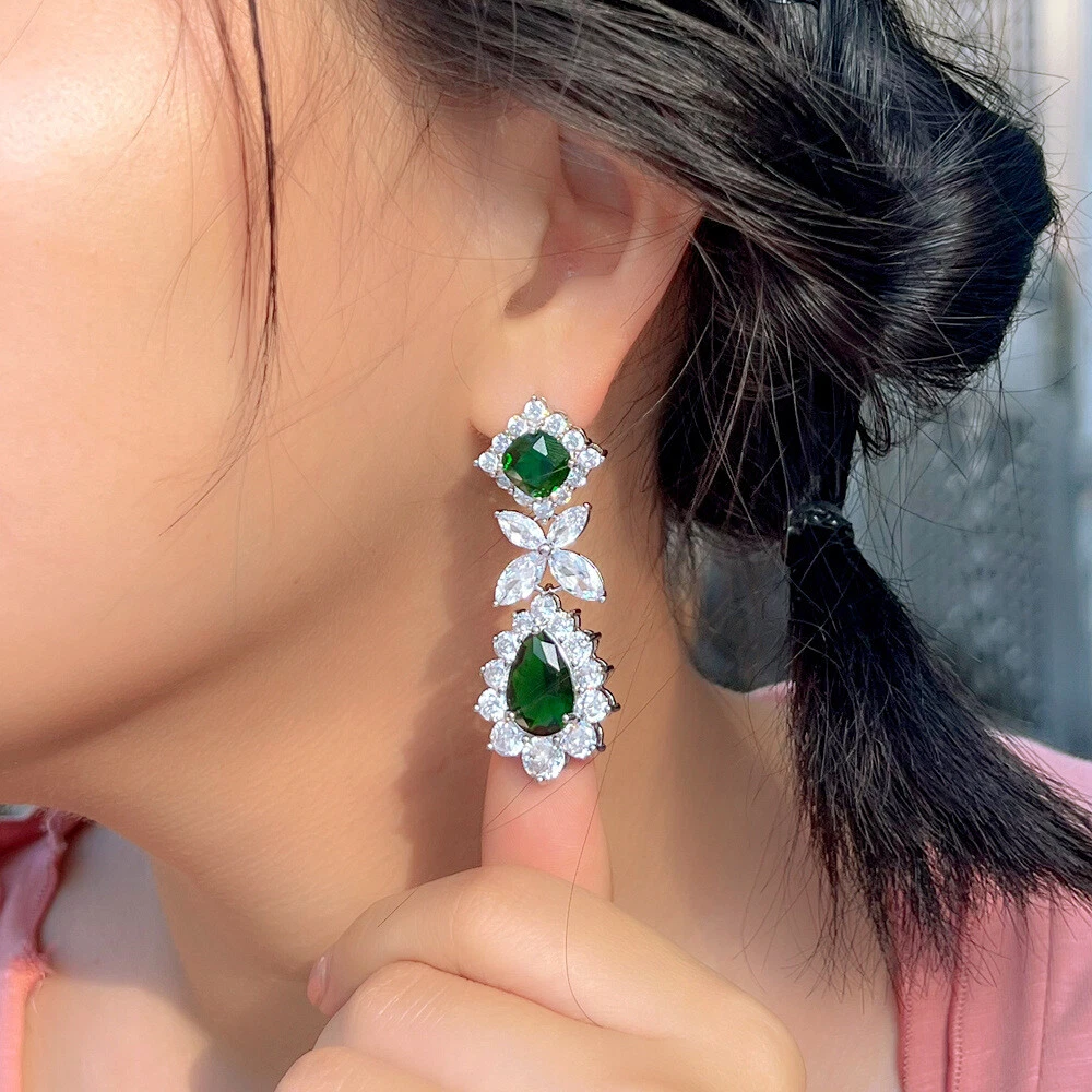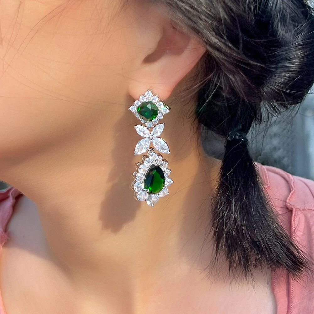 Women Elegant Silver Plated Green Zirconia Long Flower Leaf Dangle Drop Earrings