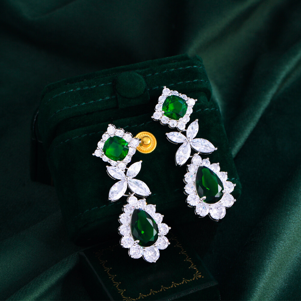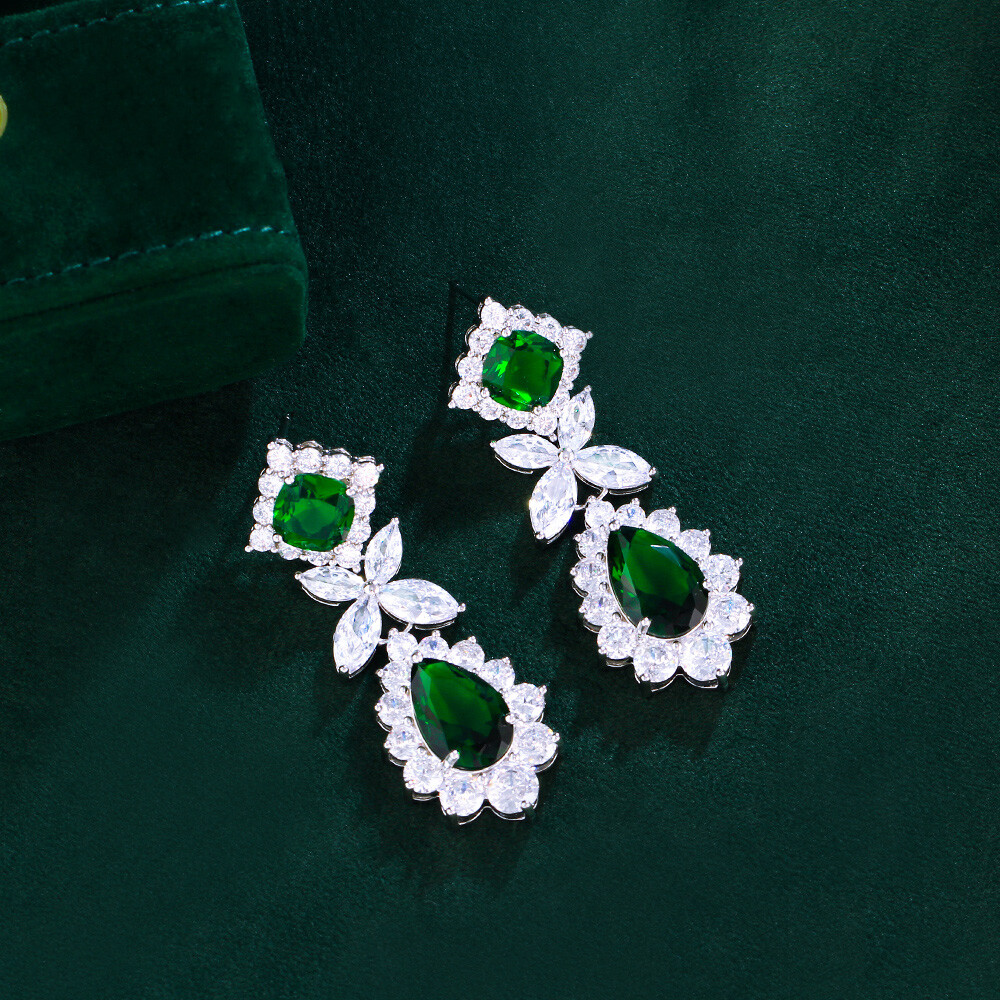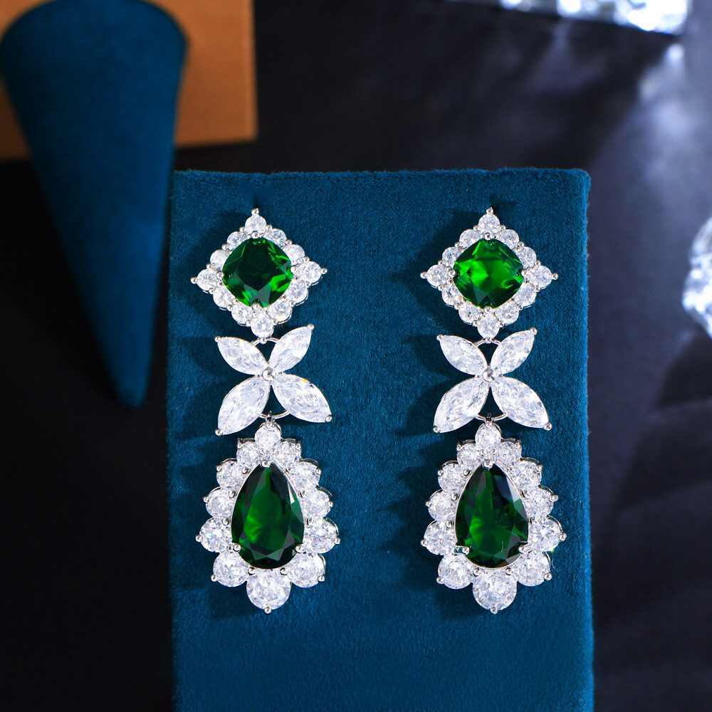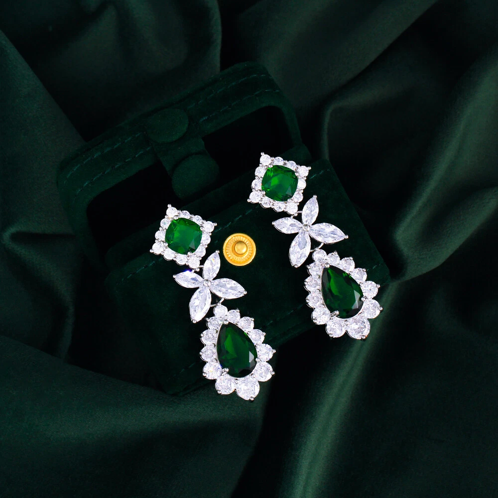 Women Elegant Silver Plated Green Zirconia Long Flower Leaf Dangle Drop Earrings