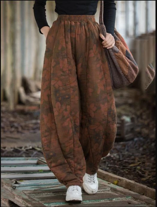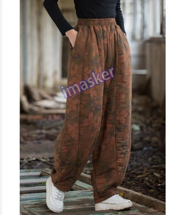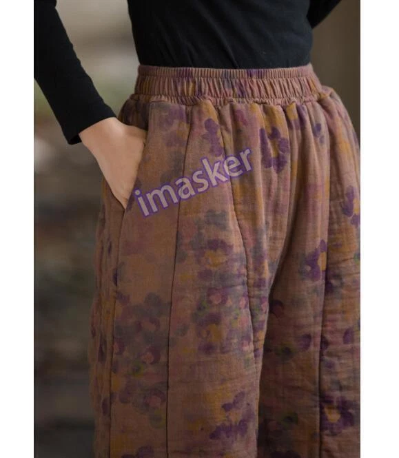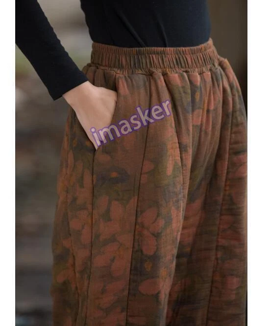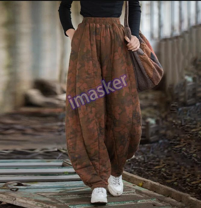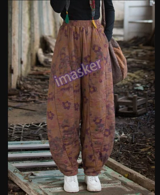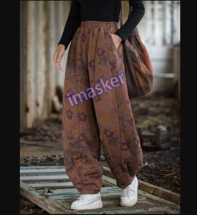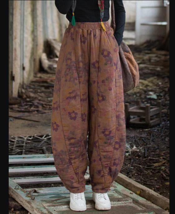 Women Fashion Floral Linen Cotton Quilted Elastic Waist Harem Pants Trousers