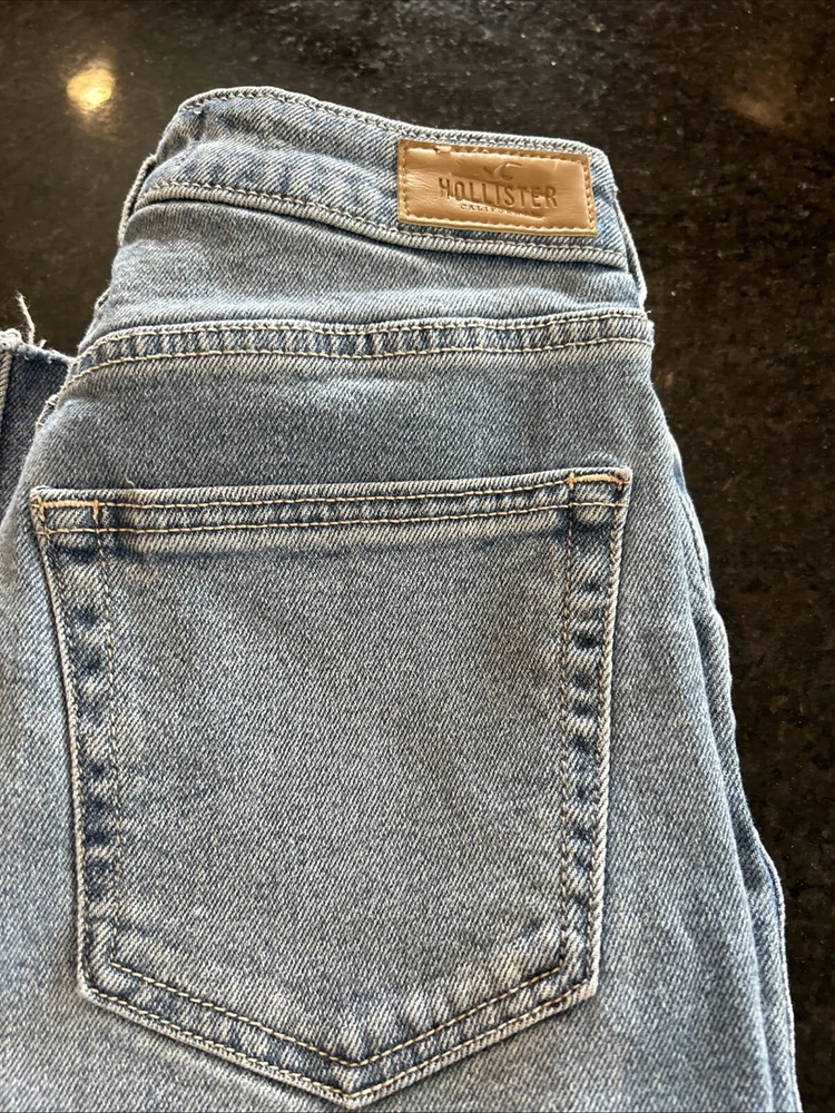 Elevate your denim game with these ultra-high rise vintage straight jeans from Hollister. The timeless blue color and solid pattern make them a versatile addition to any wardrobe. The fabric wash is medium, and the fabric type is denim, which gives them a classic feel and a durable edge. These jeans feature a zip and button closure, with a low rise of 6.5-8.5 inches and a waist size of 27 inches. The cotton blend material ensures comfort, while the accents of a zipper add a touch of style. These jeans are perfect for any casual occasion, and their regular fit and size type make them suitable for women of all shapes and sizes.