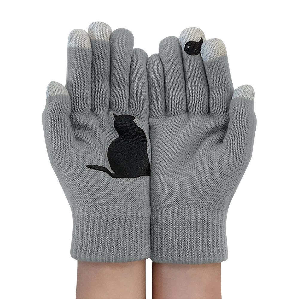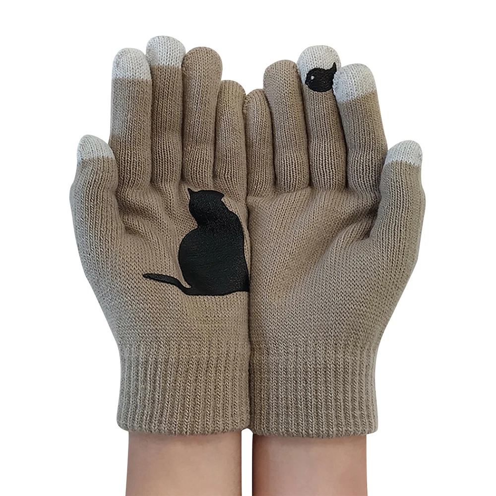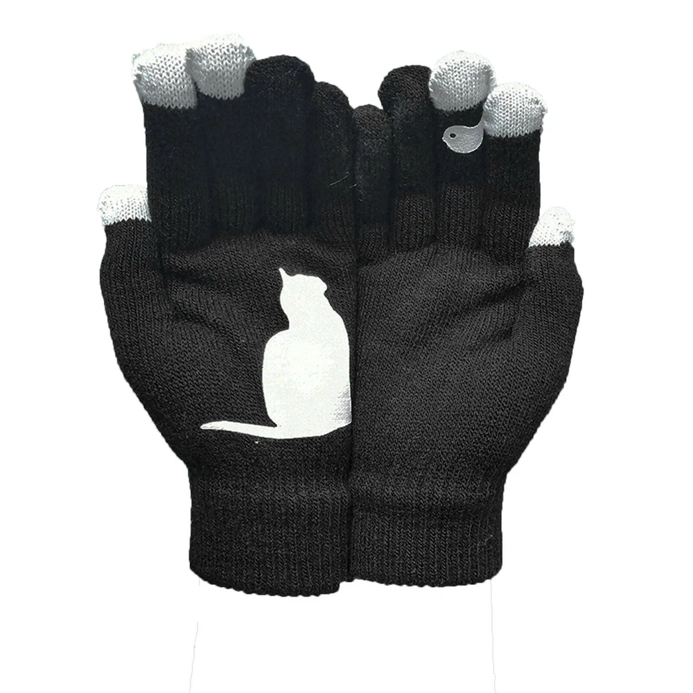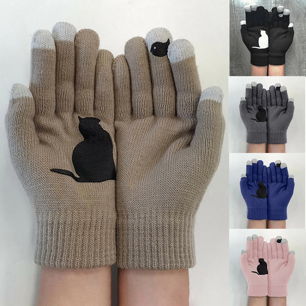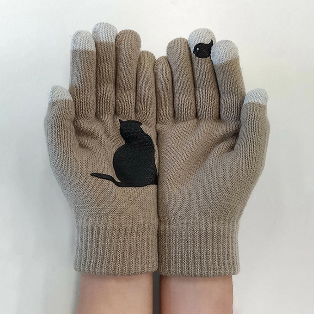 Women Lady Winter Warm Animal Cat Printed Knitted Gloves Thermal Gloves Mittens
