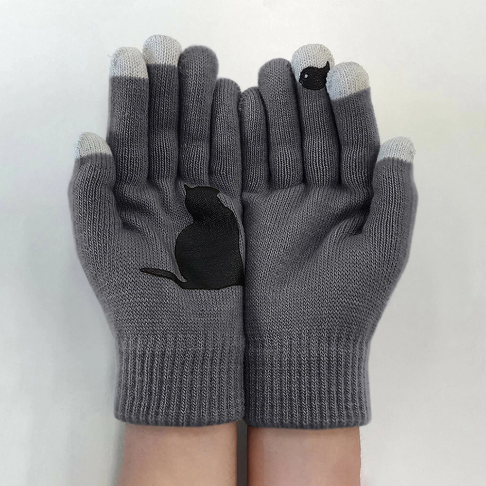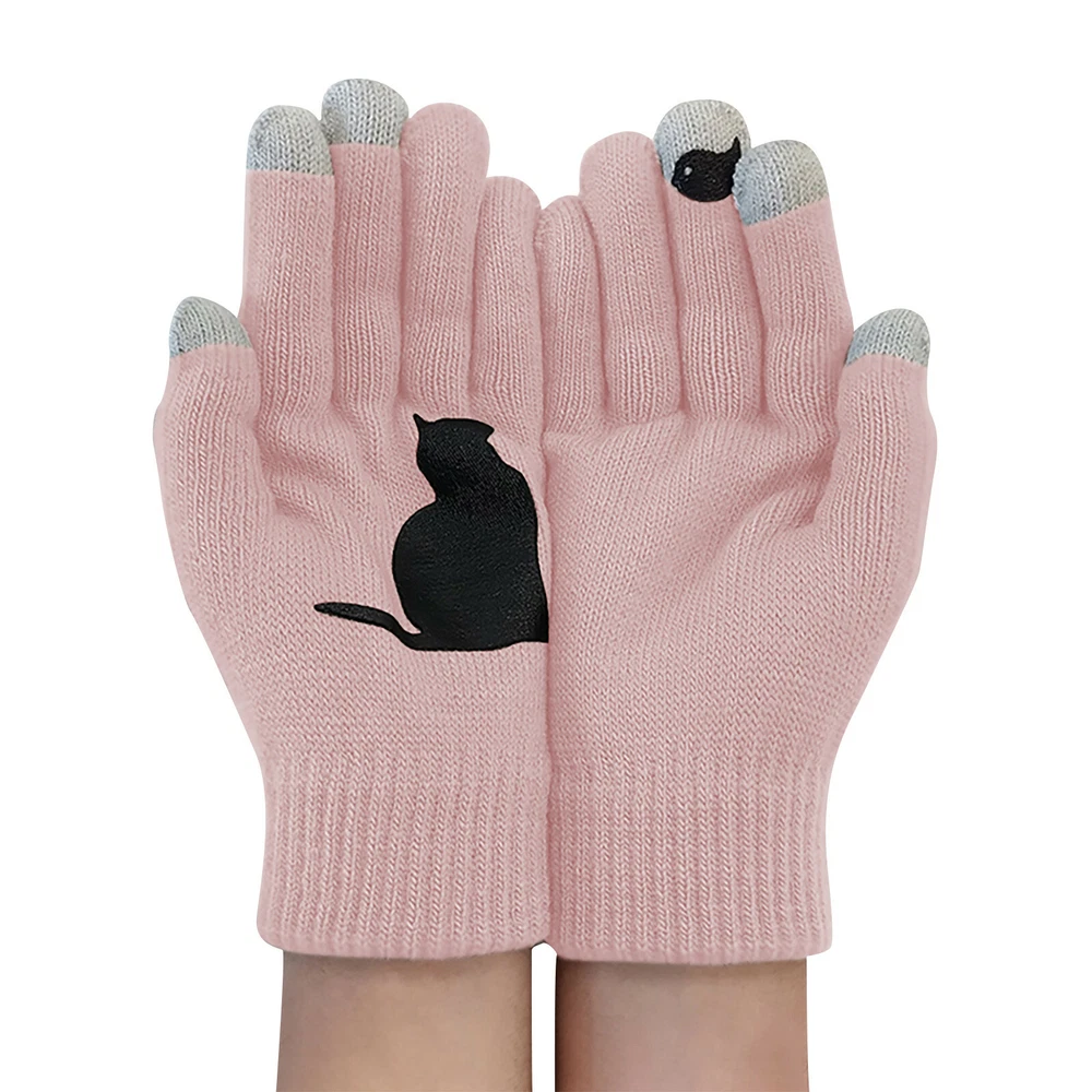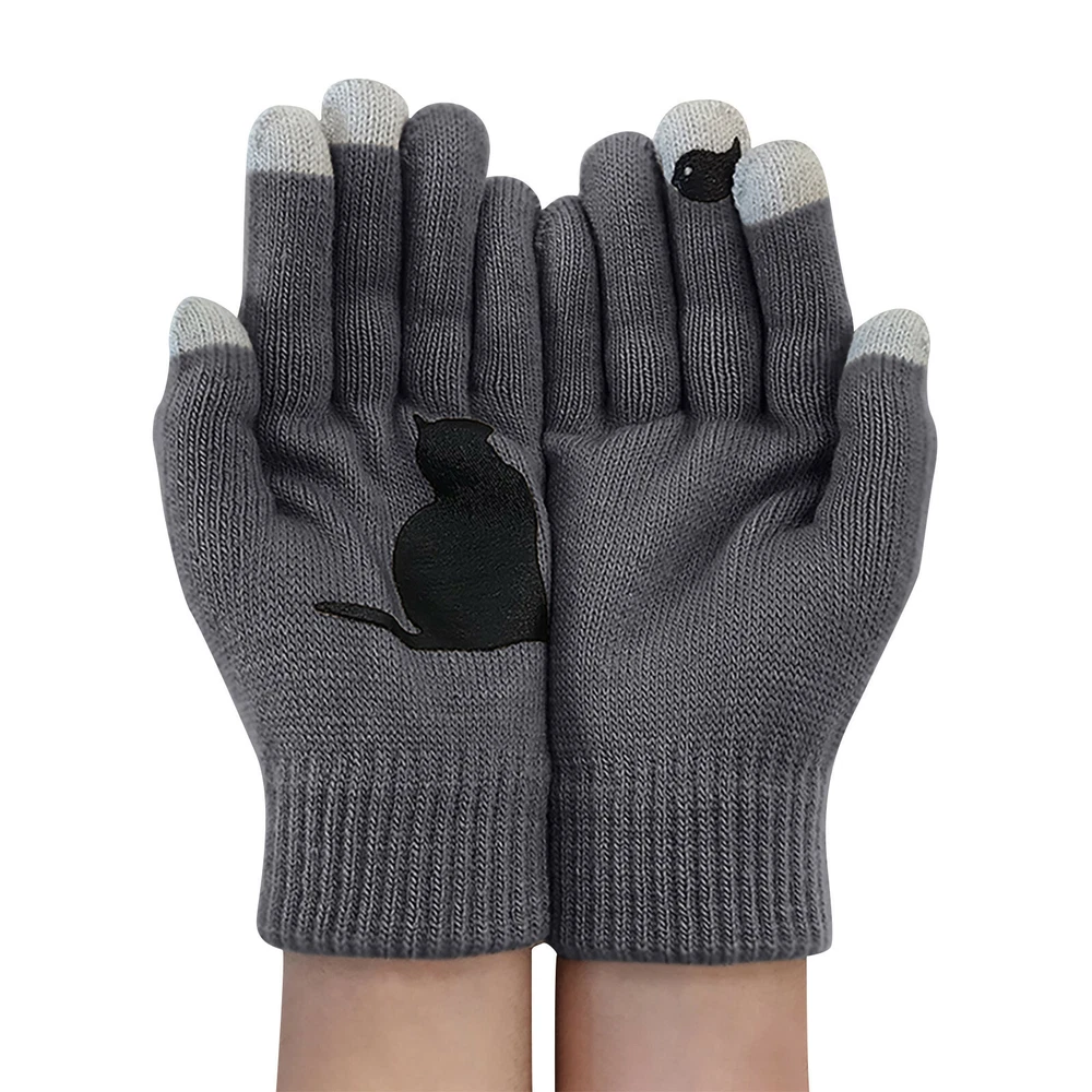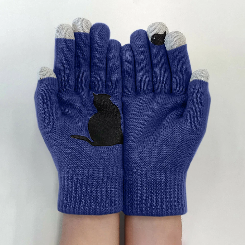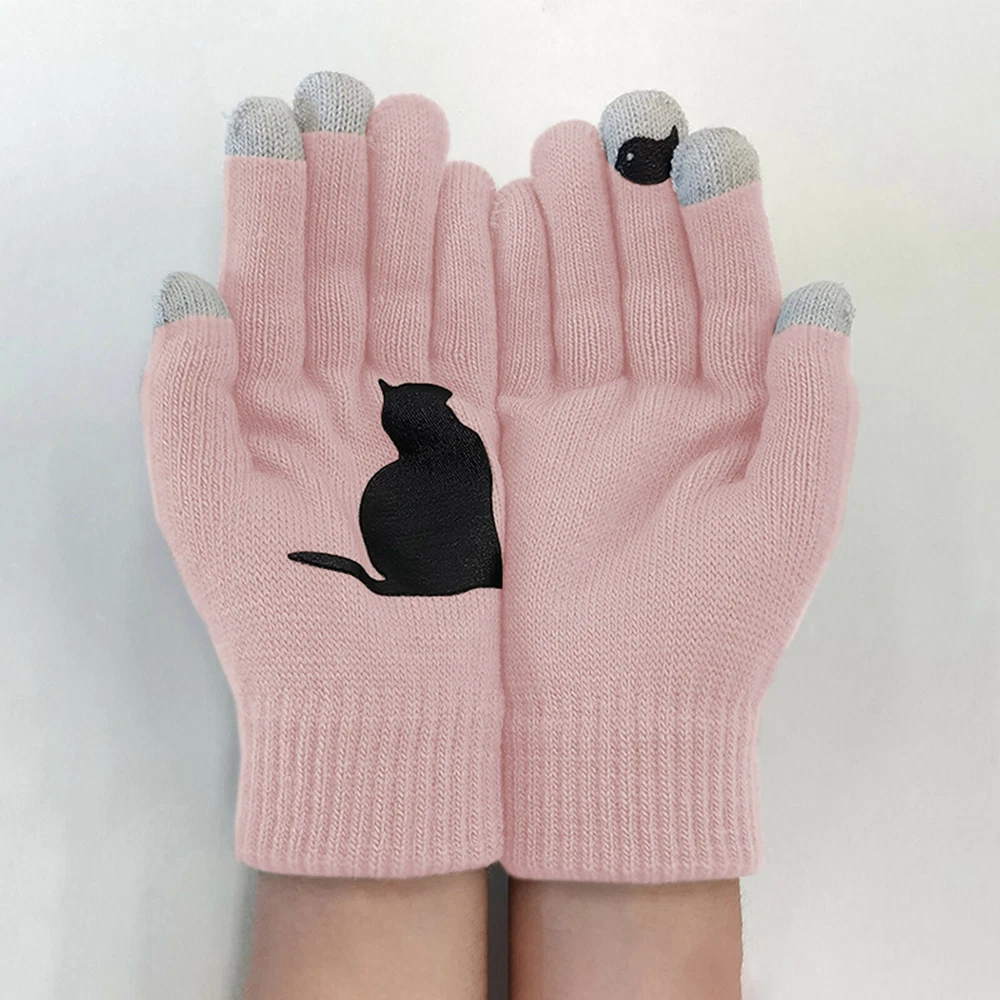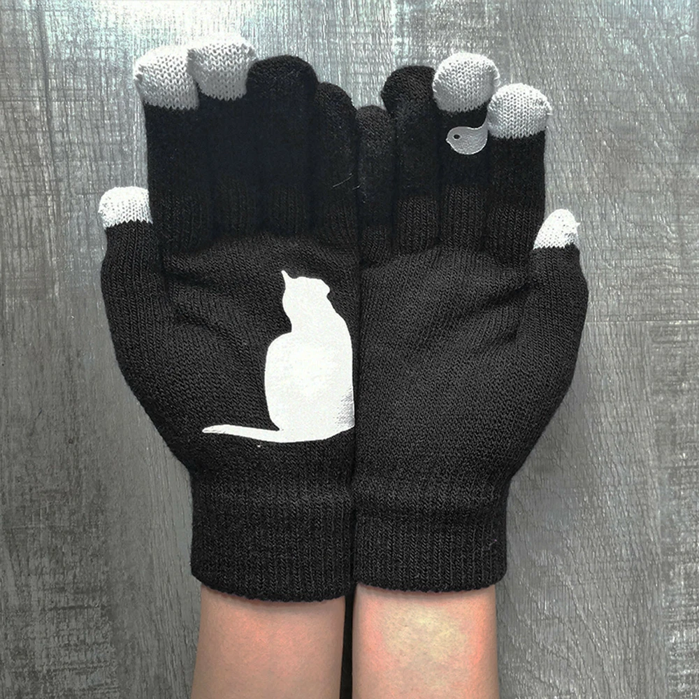 Women Lady Winter Warm Animal Cat Printed Knitted Gloves Thermal Gloves Mittens