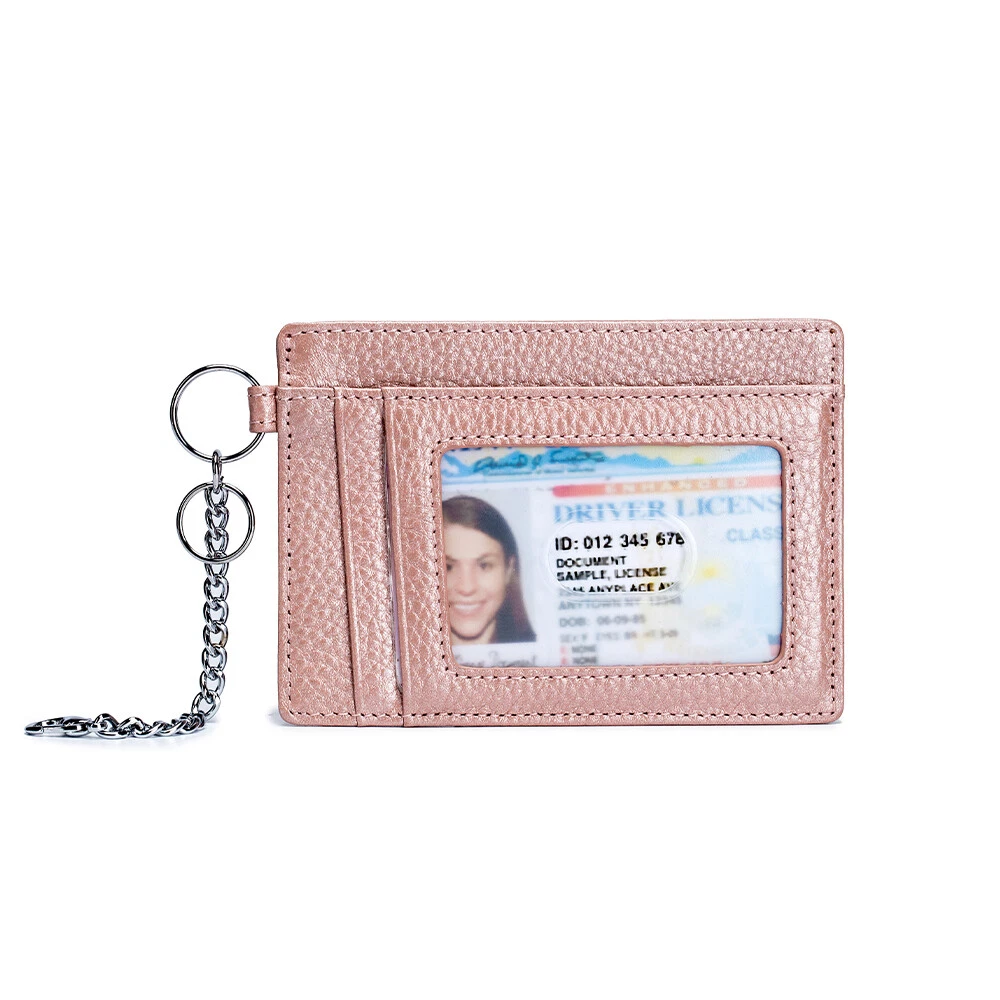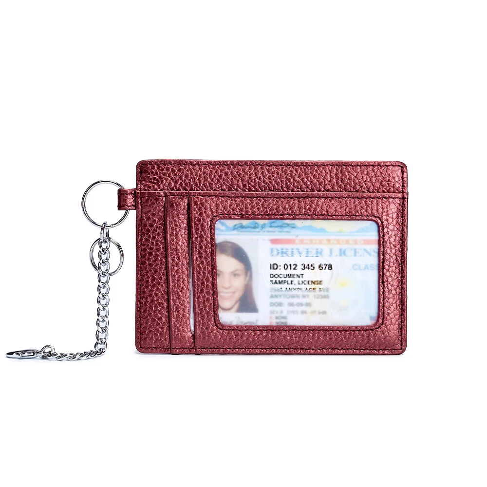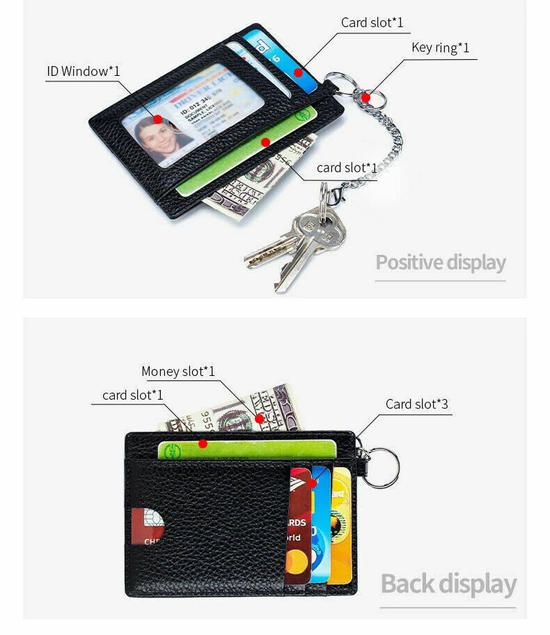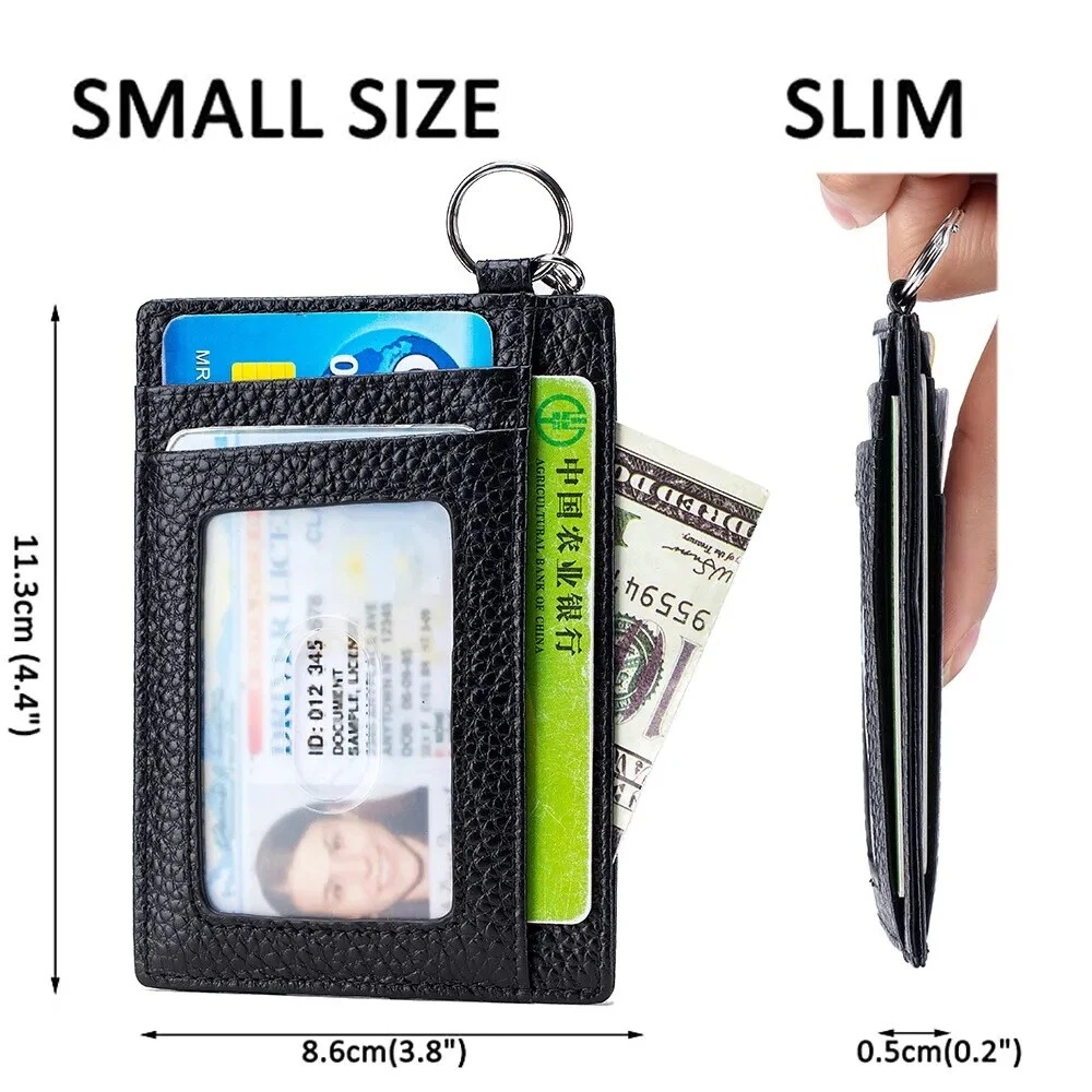 Description: Leather lining QUALITY MATERIAL: Card wallet is made of quality real lichi patten leather, soft, durable and delicate with soft inner fabric by the finest craftsmanship. SMALL SLIM & COMPACT: 11.3CM*8.6CM (4.4"*3.38") with 7.2CM*4.8CM (2.8"*1.88") ID Version. Slim & small enough to put your front/back pockets or your handbags. Compact and useful for your daily use. MINI but FUNCTIONLA & RFID BLOCKING: 6 card slots and1 ID window outside, 1 pocket for cash, coins, change and daily accessories. A key chain with key ring is easy to put your keys together. Our coin purse is designed with advanced RFID SECURE technology to pretect your credit cards, debit cards, smartcards, RFID driver's licenses from scanning by RFID readers and keep your cards' vital imformation safe. GIFT IDEA: More colors is coming to meets all occasions and fits your coats and dress. Note: The wallet may have some crease in the package during shipping. There may be some smell which is normal, you can put it outside for several days, then it will disappear. Package C ontent : 1 x Card wallet