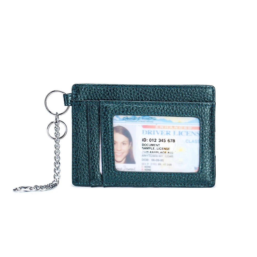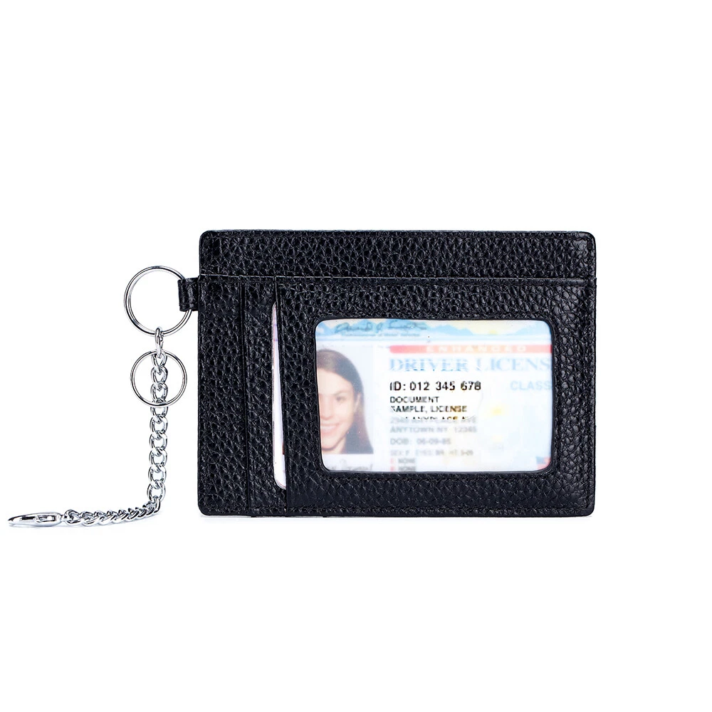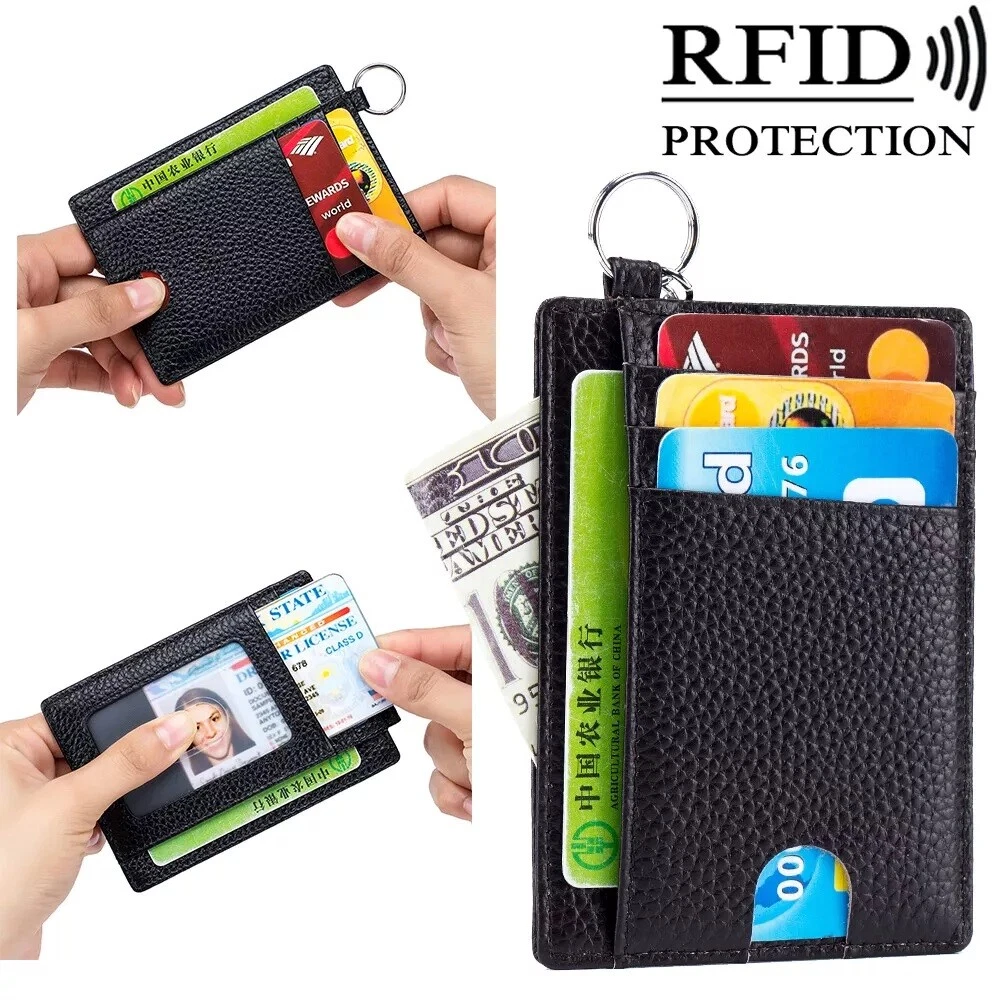 Description: Leather lining QUALITY MATERIAL: Card wallet is made of quality real lichi patten leather, soft, durable and delicate with soft inner fabric by the finest craftsmanship. SMALL SLIM & COMPACT: 11.3CM*8.6CM (4.4"*3.38") with 7.2CM*4.8CM (2.8"*1.88") ID Version. Slim & small enough to put your front/back pockets or your handbags. Compact and useful for your daily use. MINI but FUNCTIONLA & RFID BLOCKING: 6 card slots and1 ID window outside, 1 pocket for cash, coins, change and daily accessories. A key chain with key ring is easy to put your keys together. Our coin purse is designed with advanced RFID SECURE technology to pretect your credit cards, debit cards, smartcards, RFID driver's licenses from scanning by RFID readers and keep your cards' vital imformation safe. GIFT IDEA: More colors is coming to meets all occasions and fits your coats and dress. Note: The wallet may have some crease in the package during shipping. There may be some smell which is normal, you can put it outside for several days, then it will disappear. Package C ontent : 1 x Card wallet