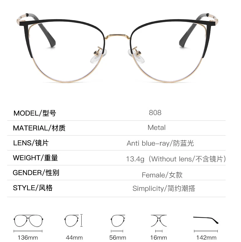 Women Metal Cat Eye Anti Blue Light Eyeglasses Clear Lens Retro Glasses Frames Description Brand: FELRES Frame Material : Metal Lens Material: Resin Frame Shape : Cat Eye Gender: Women Lens width:about 56 mm Vertical :about 44 mm Bridge :about 16 mm Frame width:about 136 mm Temple Length :about 142 mm Package including: 1 * Optical glasses(No box and other accessories) Note: 1. Due to the different monitor and light effect, the actual color of the item might be slightly different from the color showed on the pictures. Thank you! 2. Please allow 1-3mm measuring deviation due to manual measureme Brand FELRES Country/Region of Manufacture China Frame Material Metal MPN Does Not Apply Type Eyeglasses Style Cat Eye Frame Width 136 mm Temple Length 142 mm Model 808 Lens Socket Width 56 mm Department Women Features Cat Eye Bridge Width 16 mm Theme Classic, Designer, Outdoor Personalized No Year Manufactured 2020-2029 Vertical 44 mm Frame Color Gold&Brown