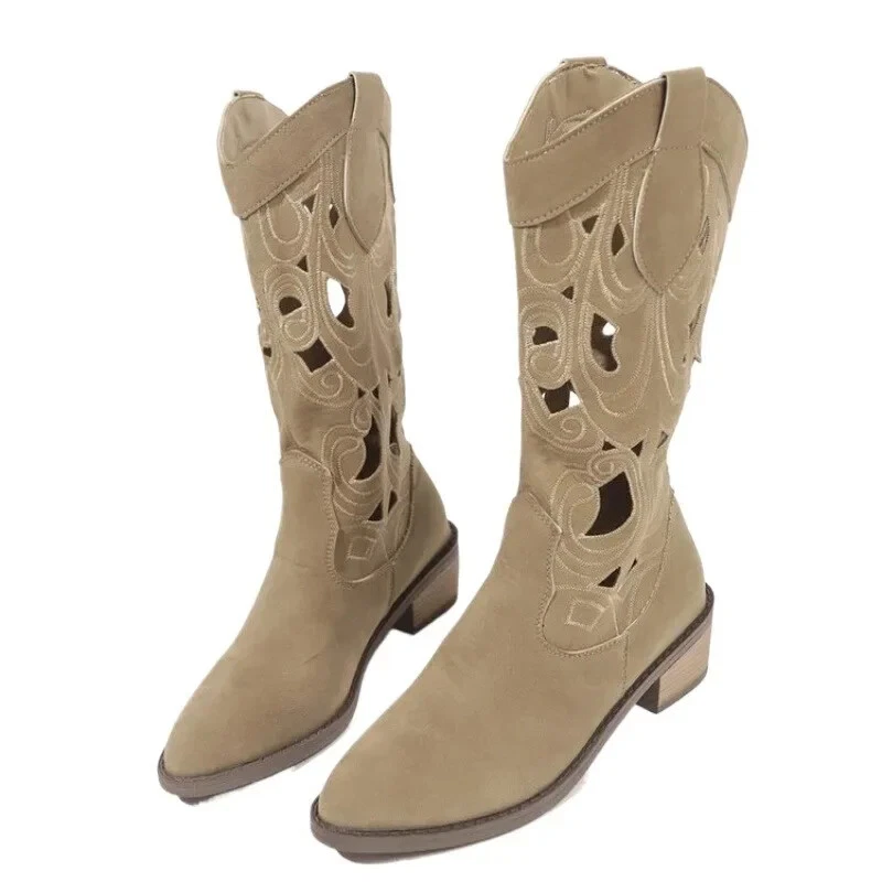 Women Mid-Calf Western Boots Heels Embroidery Hollow Cowboy Boots for Women Aut