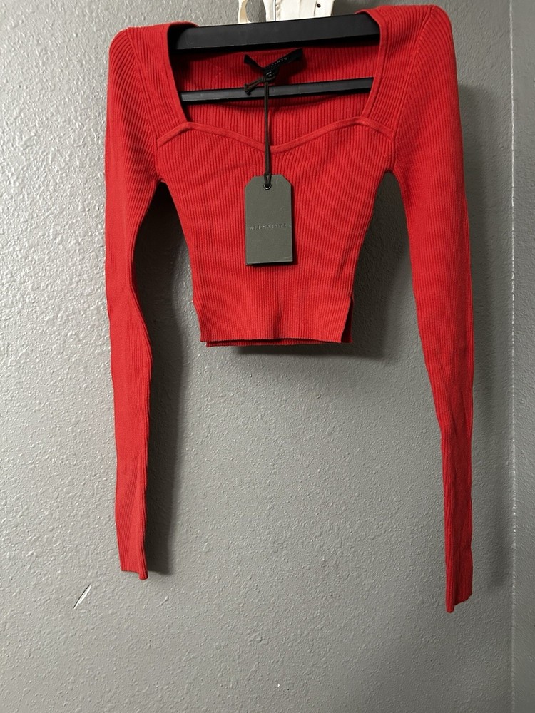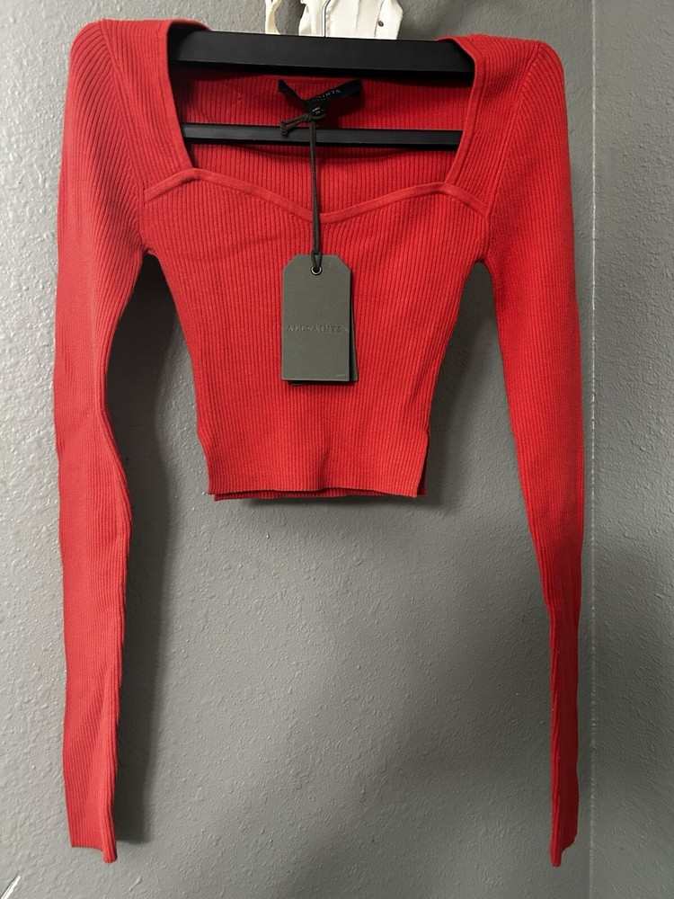 Elevate your wardrobe with this stunning red cropped ribbed sweater from AllSaints. This classic pullover style sweater features a square neckline, long sleeves, and a solid pattern. The XS size is perfect for those who want a comfortable and flattering fit. The sweater also boasts a cropped design, making it perfect for pairing with high-waisted jeans or skirts. Its ribbed accents add a touch of texture and depth to the sweater. Whether you're dressing it up or down, this sweater is sure to make a statement.