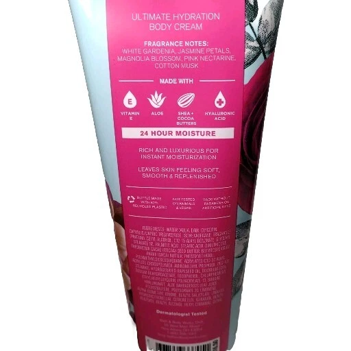 Scent:JasmineBrand:Bath & Body WorksColor:PinkFeatures:Animal Cruelty-Free, Contains VitaminsCountry/Region of Manufacture:United StatesSize:RegularDepartment:WomenType:Body CreamVolume:10 fl ozProduct Line:Bath & Body Works Dark KissBody Area:BodyMPN:noneFormulation:CreamIngredients:Vitamin E, Shea Butter, Aloe, Hyaluronic AcidSkin Type:Normal Skin