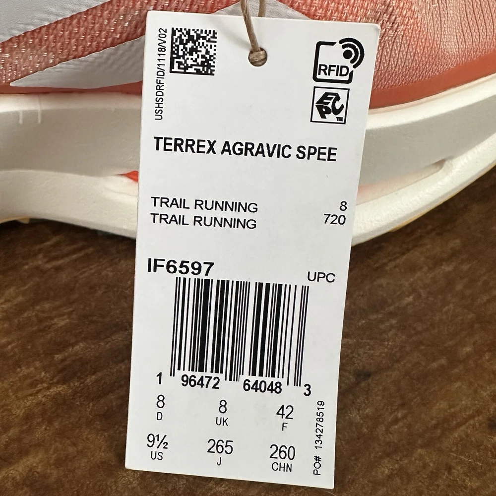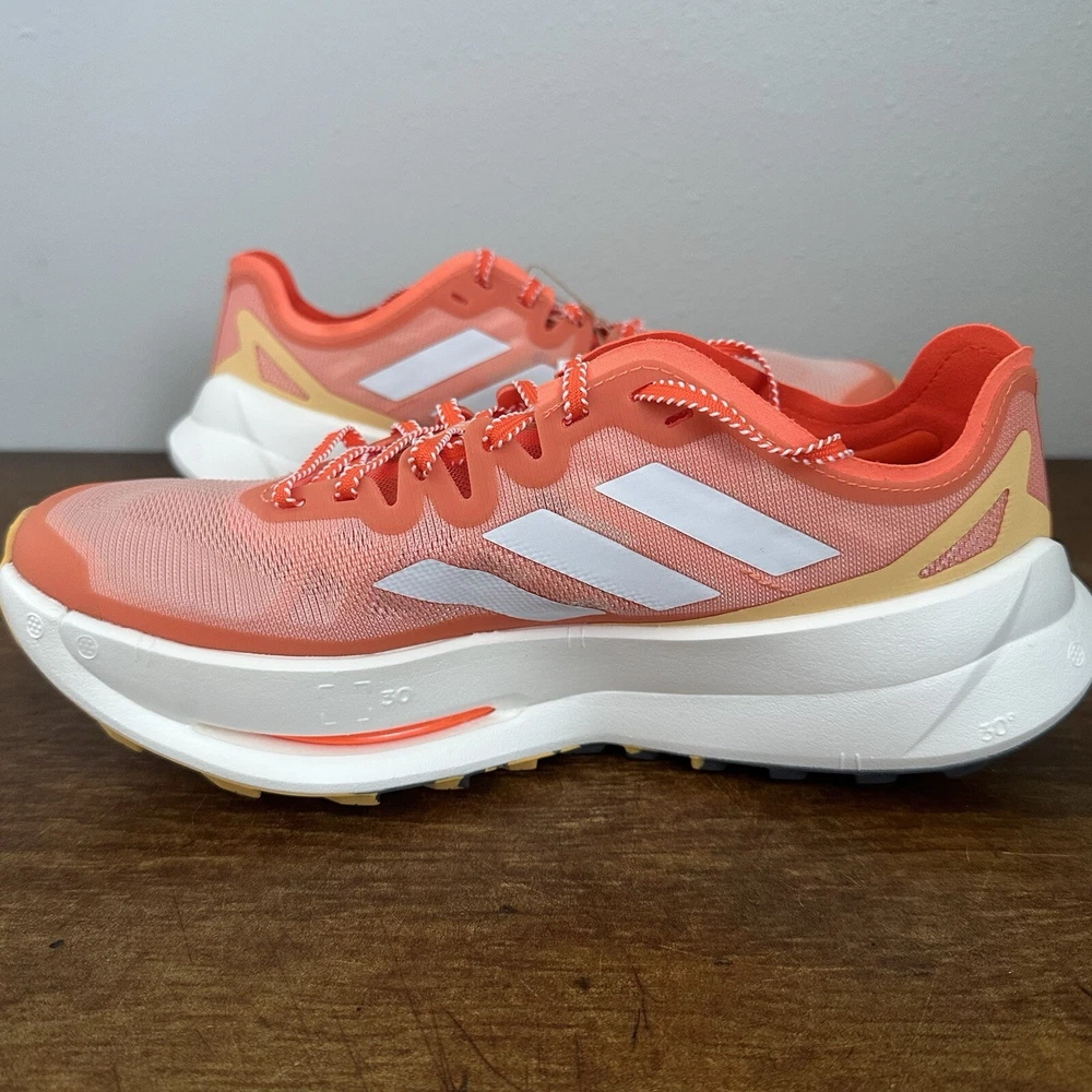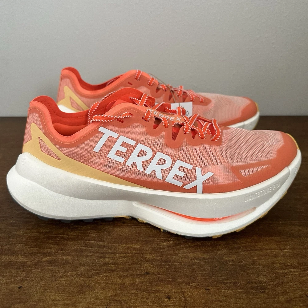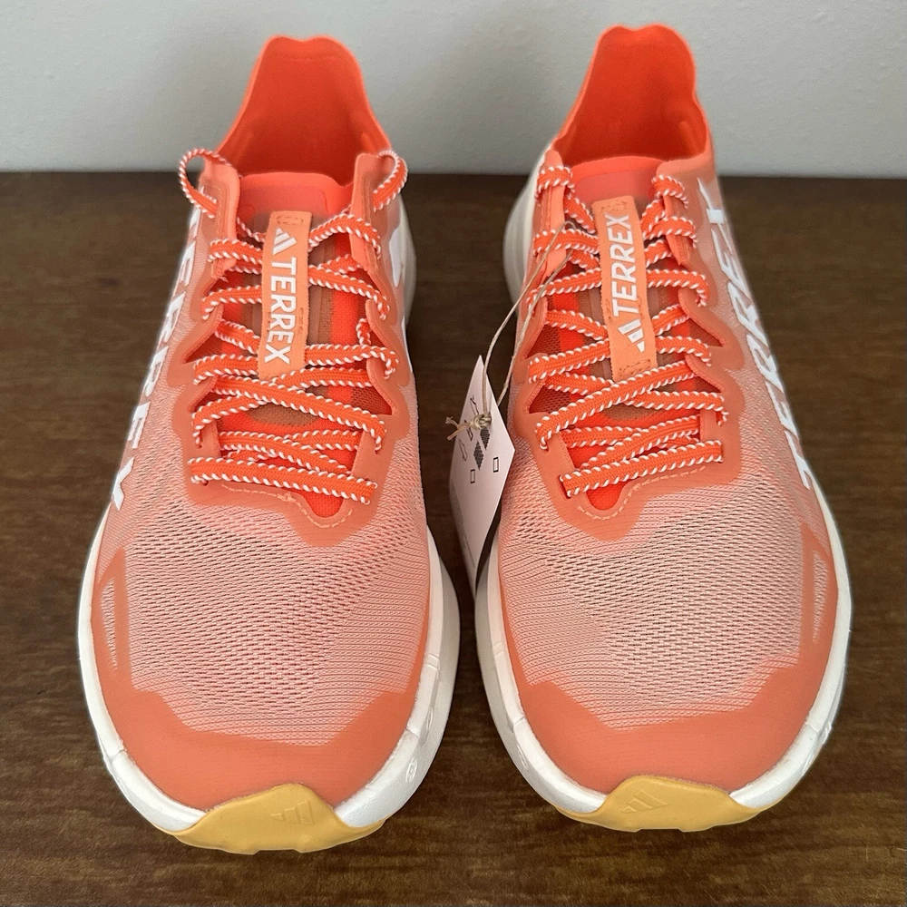 Step into your outdoor adventures with the adidas TERREX Agravic Speed Ultra Amber Tint Semi Spark, a sneaker designed to keep pace with your active lifestyle. Featuring a vibrant orange colorway that commands attention, this shoe is as stylish as it is functional. The synthetic upper material provides durability while the breathable and cushioned features ensure maximum comfort for your walking, hiking, and running endeavors. The low top silhouette and standard shoe width cater to a snug and secure fit, enhanced by the classic lace-up closure. The TERREX Agravic model, with its solid pattern and prominent adidas logo accents, offers a seamless blend of performance and sports-inspired aesthetics. Ready for any activity that comes your way, these athletic shoes are a smart addition to your footwear collection. New without box
