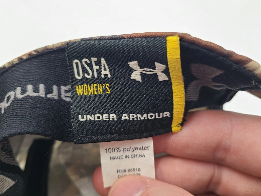 Material: Polyester Color: Brown Brand: Under armour Features: Adjustable Occasion: Activewear, Casual, Workwear Accents: Logo Department: Women Fabric Type: N/A Country of Origin: China Vintage: No Pattern: Camouflage Character: N/A Size: Adjustable Style: Army Cap Season: Fall, Spring, Summer, Winter Theme: American, Classic, Dad, Fish, Hunting, Outdoor, Sports, USA