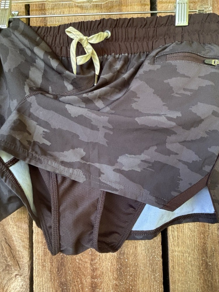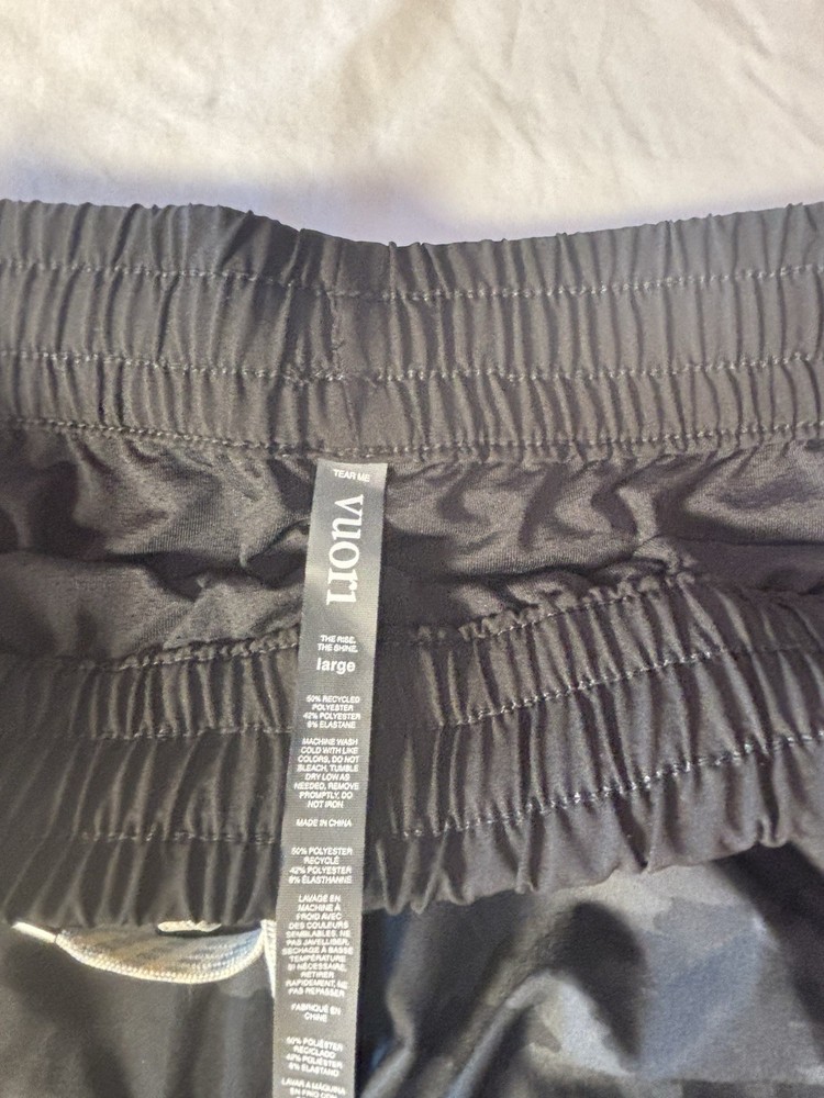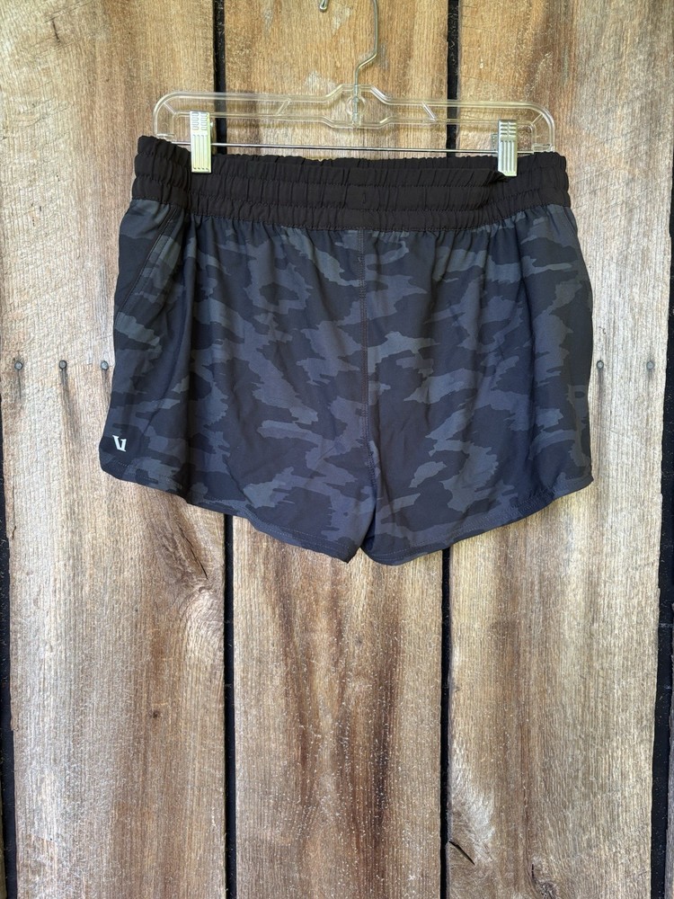 The product is a pair of Vuori Clementine Performance Shorts in a mid-rise style, designed specifically for women in a size large. The shorts feature a black watercolor camo design and have a 2.0-inch inseam, making them suitable for various activewear occasions. With a focus on athletic style, these shorts offer both comfort and functionality for active women looking for a versatile and stylish addition to their activewear collection.