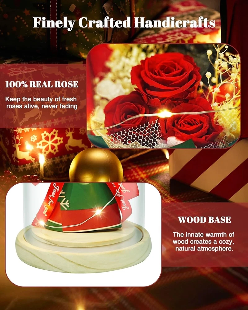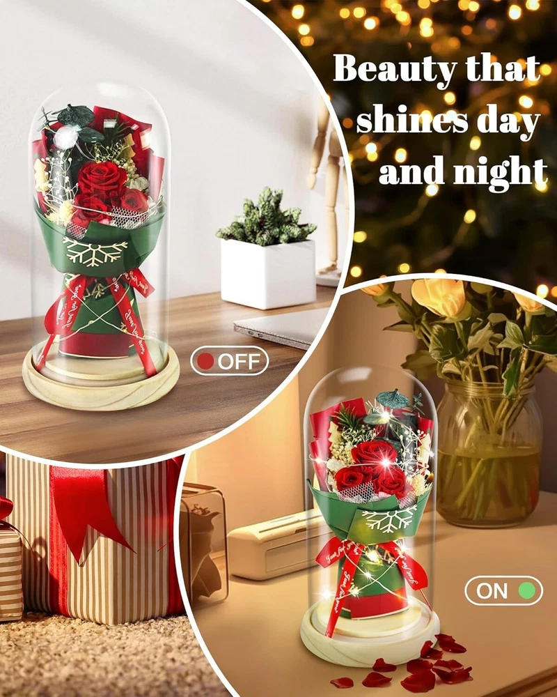 【100% Real Flower】Our preserved Flowers bouquet is made from natural roses and other floral materials, each flower maintaining its original color and shape. Lasting 3-5 years, this bouquet allows you to enjoy fresh flowers every day without the need for watering or maintenance 【Christmas Flowers Gift】 Eternal roses symbolize everlasting love and well wishes, making them the sweet choice for your cherished ones. Let this preserved rose bouquet bring smiles of happiness to you and your loved one 【Christmas Decorations】 Our eternal rose bouquet is meticulously handcrafted, with each rose carefully inspected to ensure you receive the most beautiful blooms. Secured within a glass dome, the bouquet protects and preserves its fresh beauty. LED lights surround the rose bouquet, ensuring its beauty shines day and night. With a wooden base for a touch of nature, it makes an exceptional indoor decoration to enhance space aesthetics and ambiance. Product dimensions are 4.1 inches wide, 8.1 inches tall. Powered by 3 AAA batteries (not included ) 【Perfect Gifts for Her】 The preserved flower item is the perfect choice for expressing love. Whether it's Valentine's Day, anniversaries, Mother's Day, birthdays, or Christmas, it makes a thoughtful present for wives, mothers, or girlfriends 【After-sales Support】 As these are handcrafted real flowers, minor differences may occur due to the handmade nature. If you are not satisfied with your purchase or encounter any issues, please contact us via Amazon email or directly through Amazon within 30 days, and we will promptly assist you