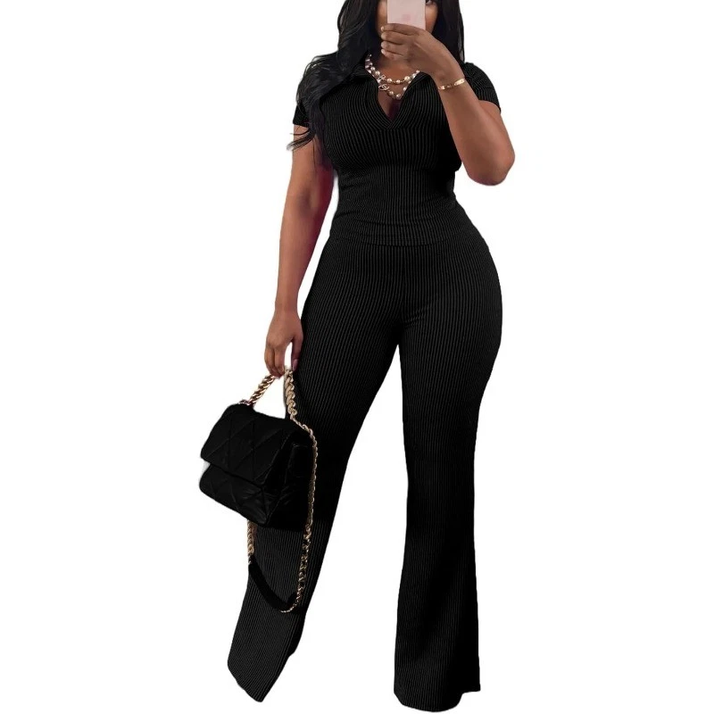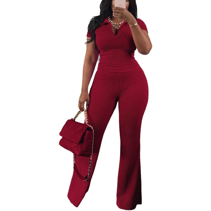 HomeWomens 2Pcs Outfit Ribbed Short Sleeve VNeck Polo Top Flare Pants Sets Tracksuit