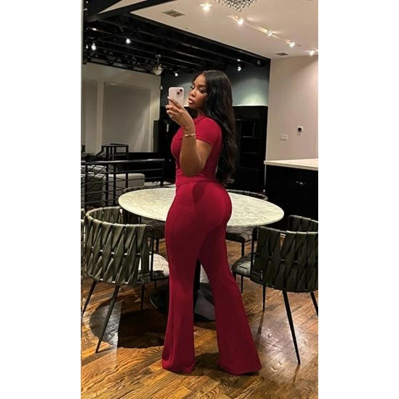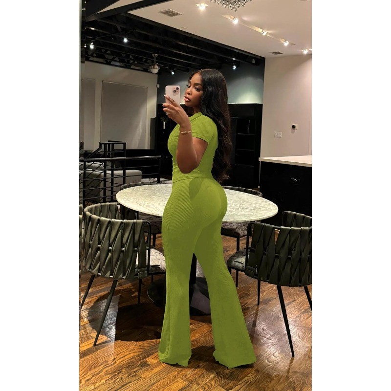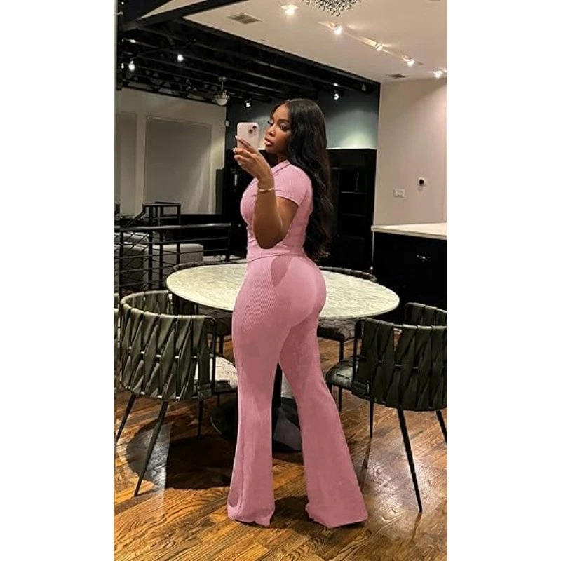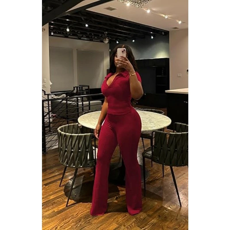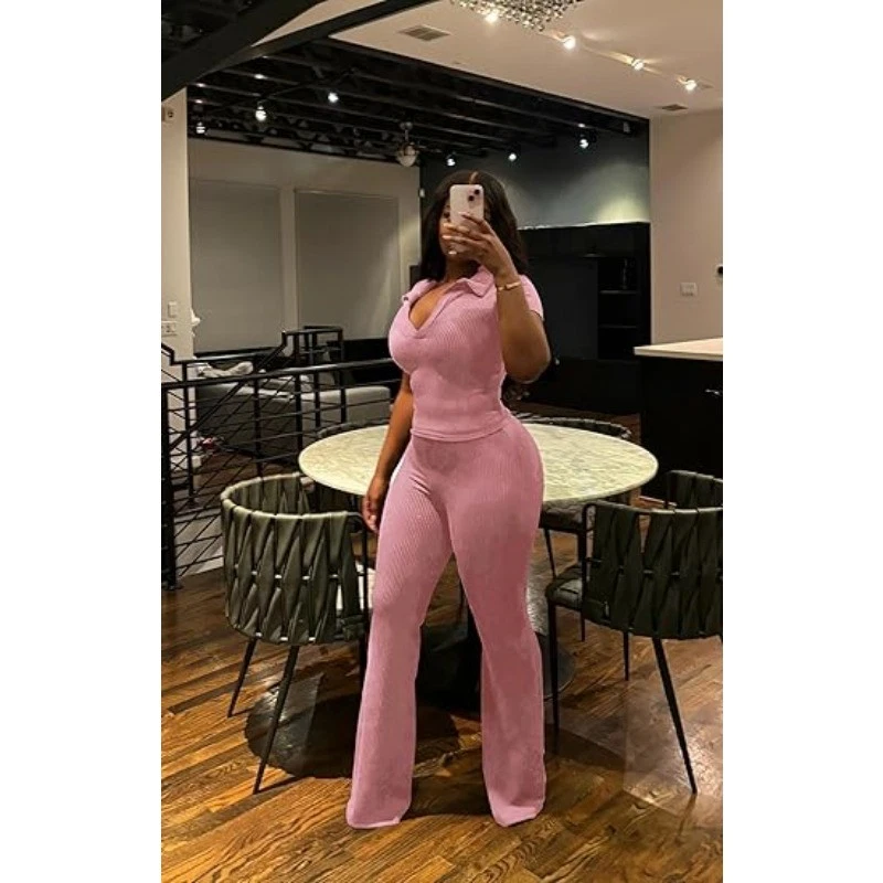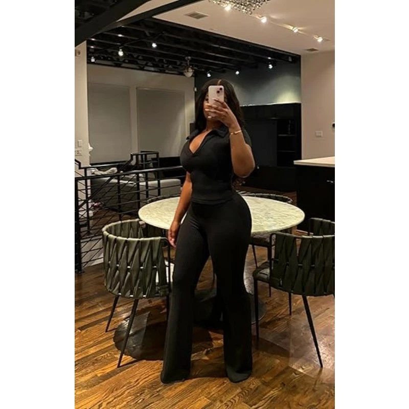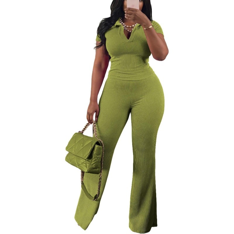 Womens 2Pcs Outfit Ribbed Short Sleeve VNeck Polo Top Flare Pants Sets Tracksuit