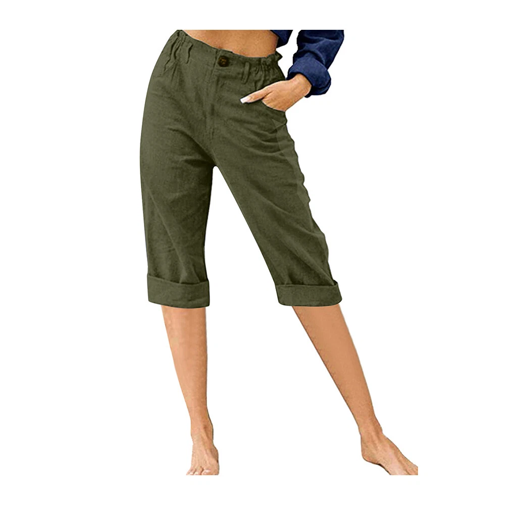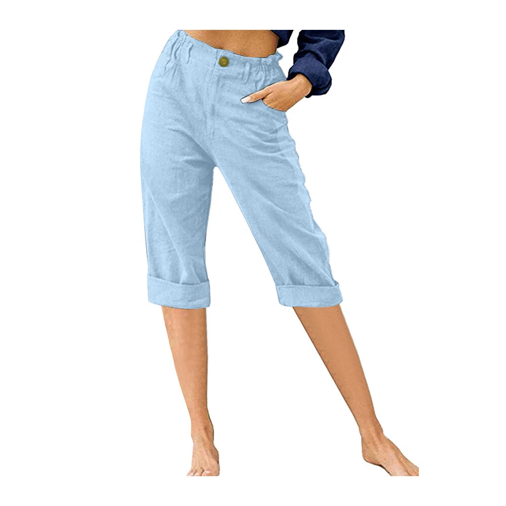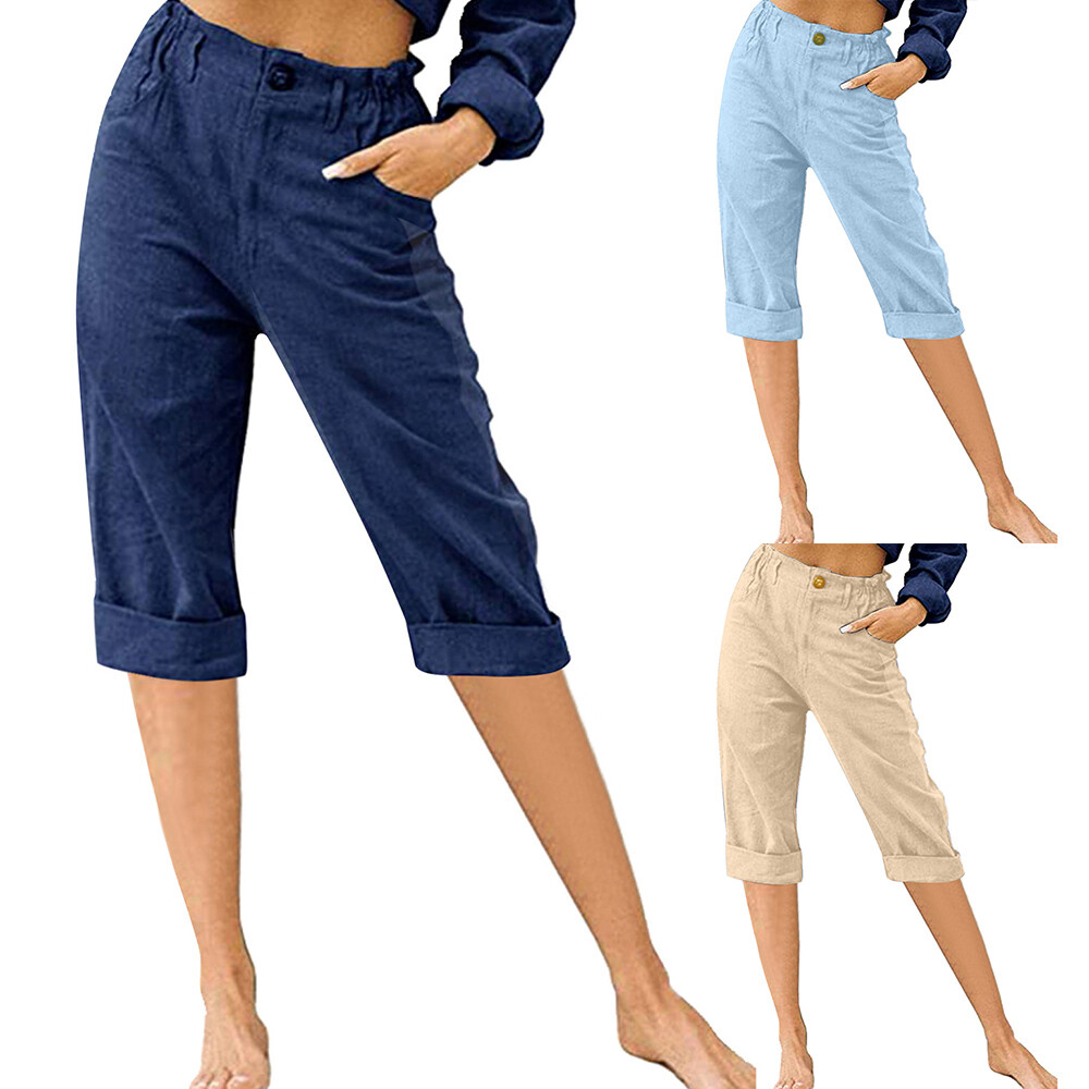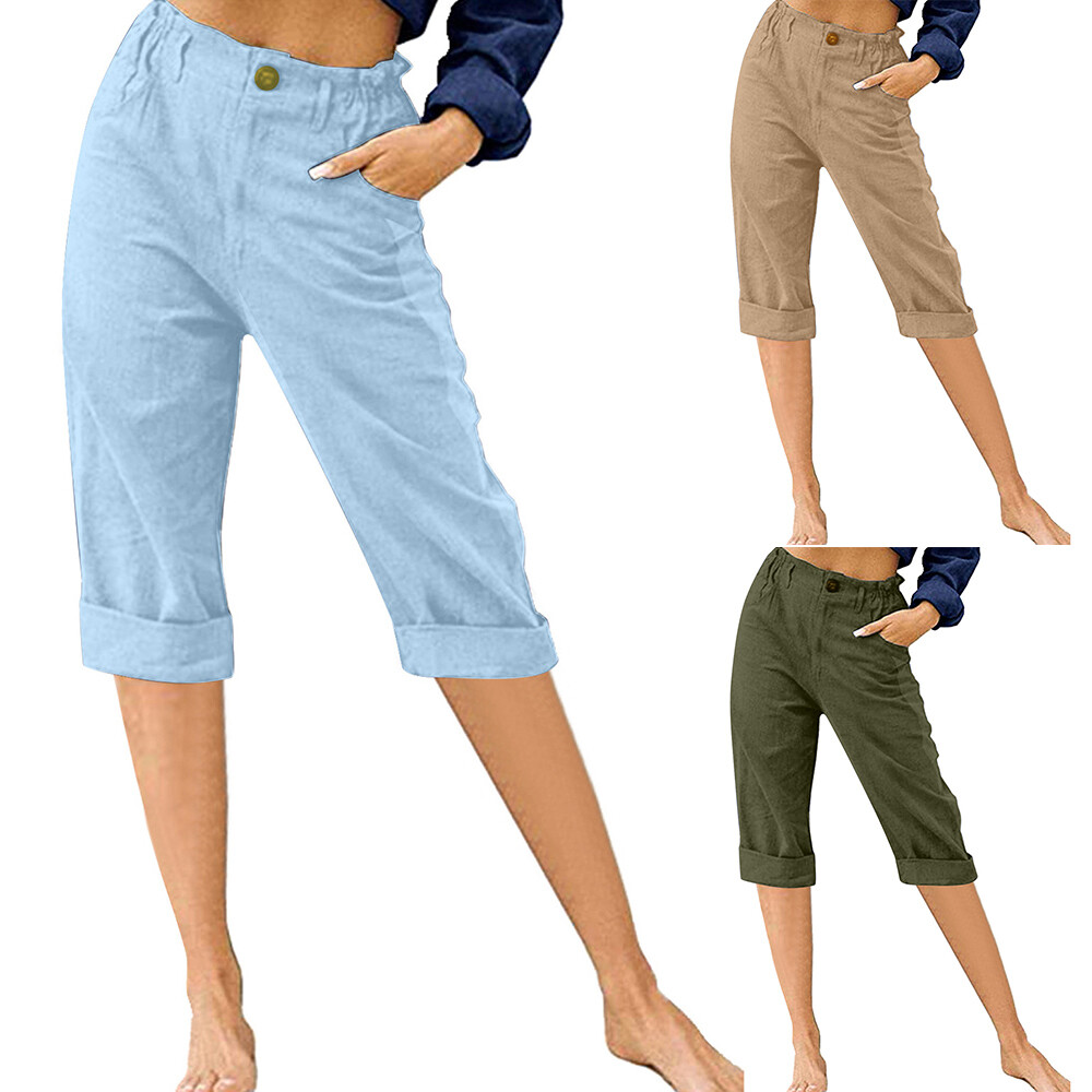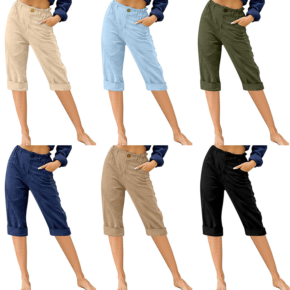 Garment Care: Machine Washable Pattern: Solid Country/Region of Manufacture: China Department: Women Fit: Regular Type: Pants Closure: Button Accents: Button Rise: High (Greater than 10.5 in) Style: Capri Theme: Holiday Personalize: No Features: Elastic Waist Leg Style: Straight MPN: Does not apply Brand: Unbranded Material: Polyester Handmade: No Vintage: No Fabric Type: Linen Occasion: Casual Size Type: Regular Front Type: Flat Front Season: Summer