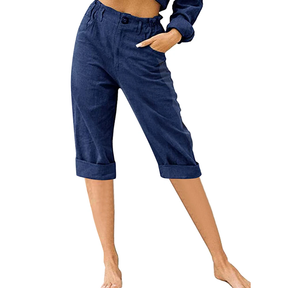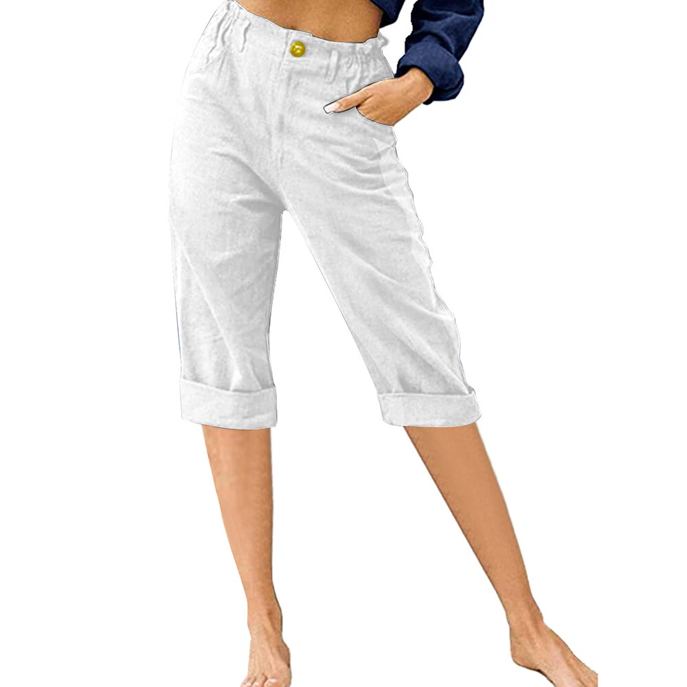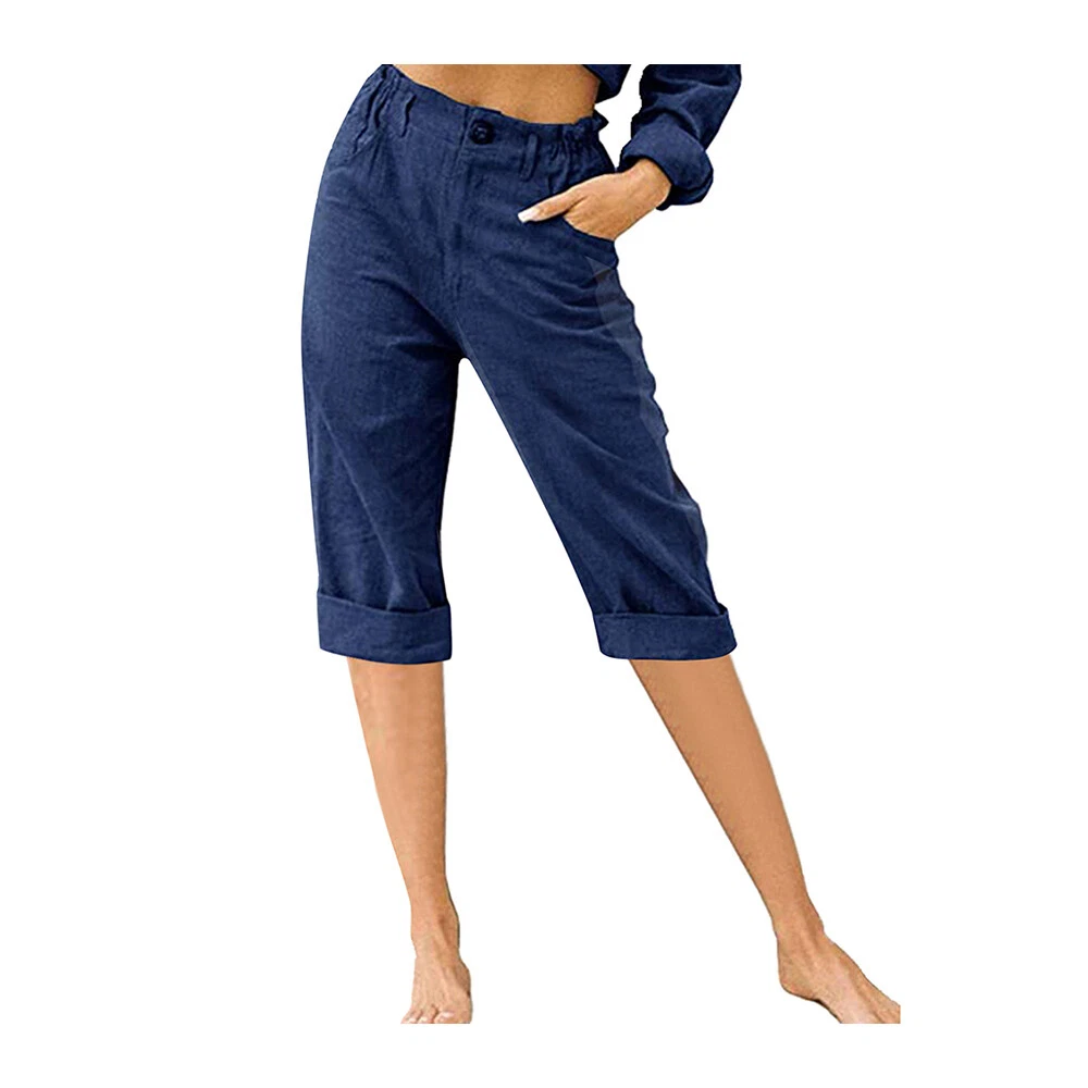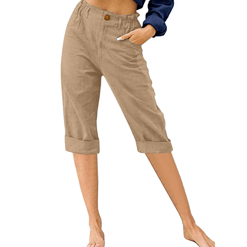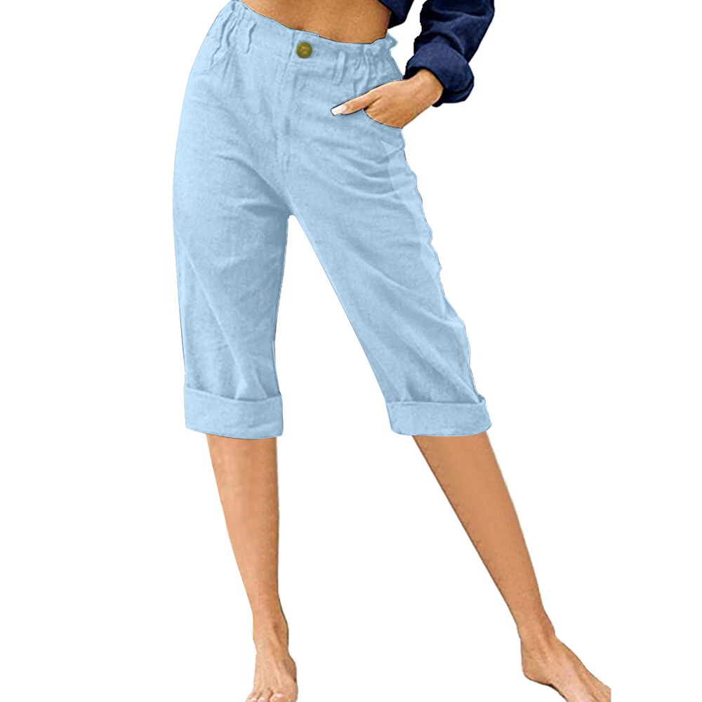 Garment Care: Machine Washable Pattern: Solid Country/Region of Manufacture: China Department: Women Fit: Regular Type: Pants Closure: Button Accents: Button Rise: High (Greater than 10.5 in) Style: Capri Theme: Holiday Personalize: No Features: Elastic Waist Leg Style: Straight MPN: Does not apply Brand: Unbranded Material: Polyester Handmade: No Vintage: No Fabric Type: Linen Occasion: Casual Size Type: Regular Front Type: Flat Front Season: Summer