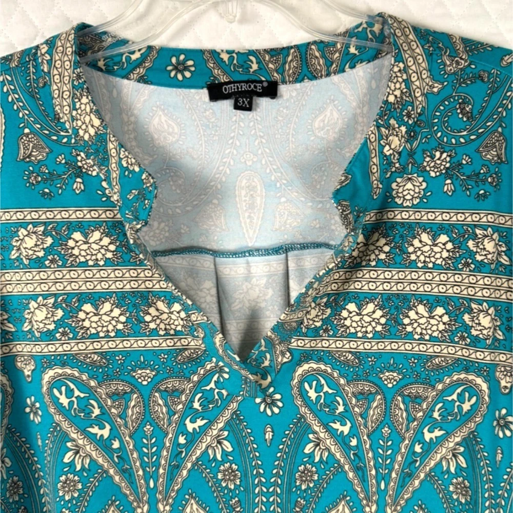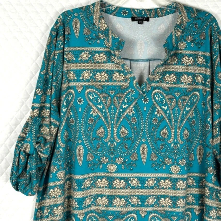 Ideal for a relaxed yet stylish look, this tunic top features a beautiful paisley print. The loose fit and lightweight material ensure comfort throughout the day. • Bohemian paisley print • 3/4-length sleeves • Keyhole neckline • Pull-on closure • Relaxed fit • Lightweight polyester • Machine washable Width = 25" (arm pit to arm pit) Lenght = 30" Sleeve - 17" (roll sleeve) Romantic, lagenlook, feminine, career, office, cottage core, paisley, art to wear, comfort, flowing