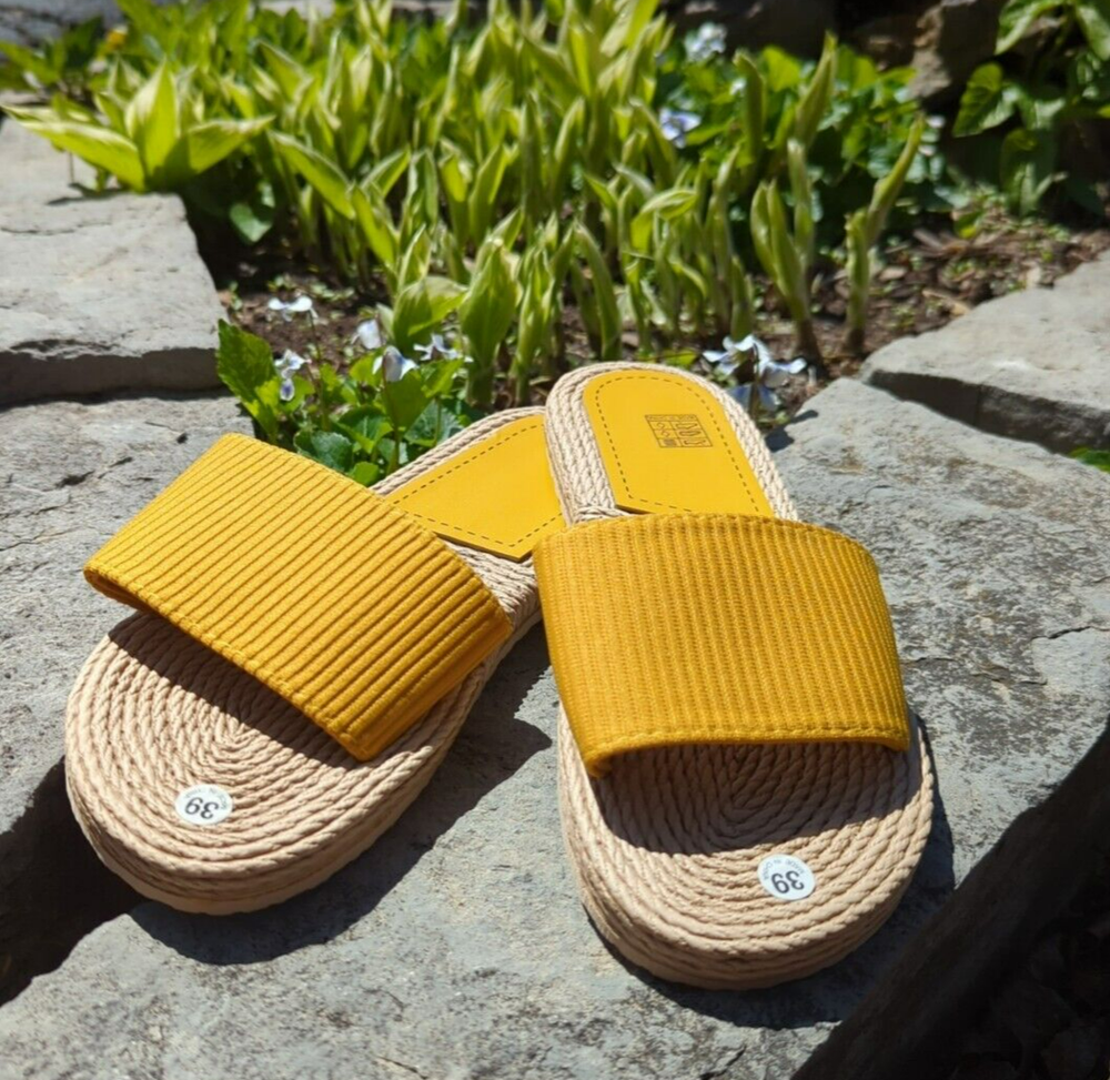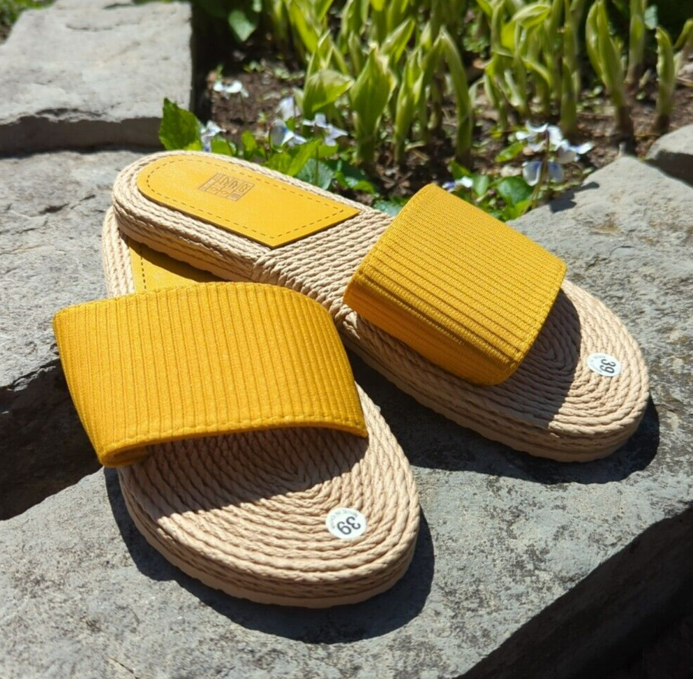 This product is a new pair of women's slipper slides in size 8.5. The brand is House and the upper material is synthetic. The style is a beach-themed slide, perfect for summer. The color is tan/yellow.