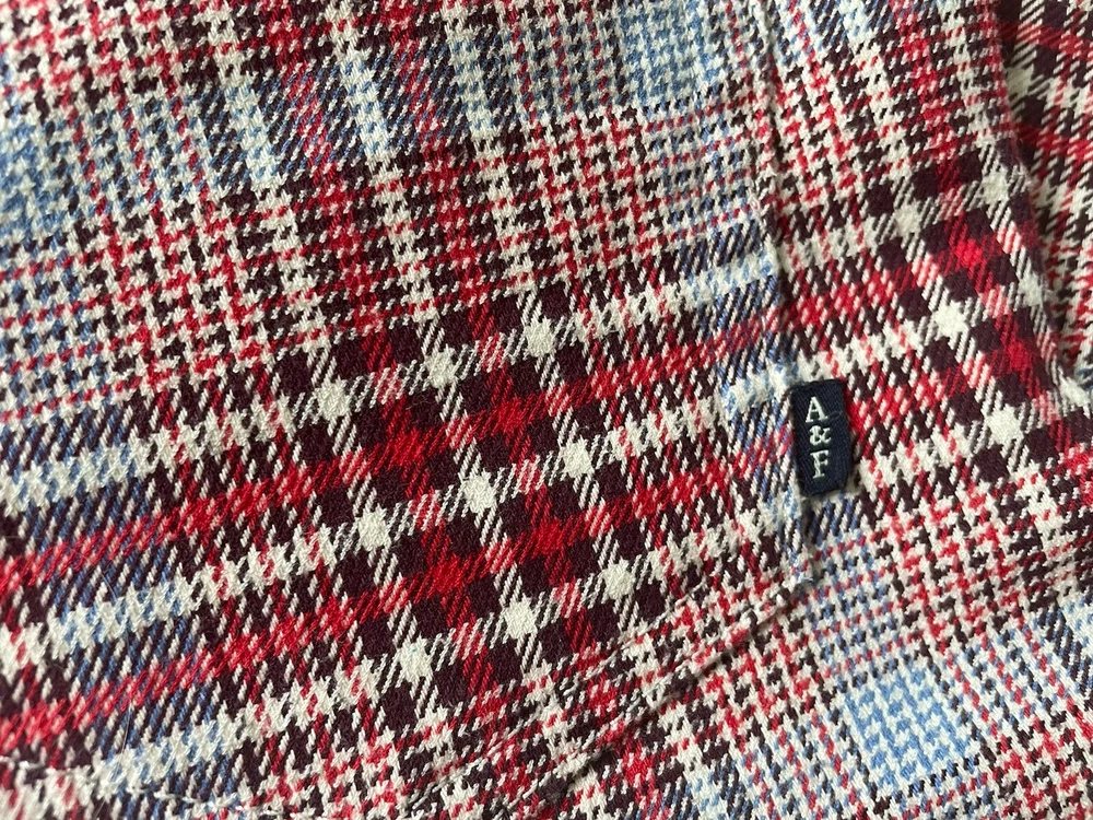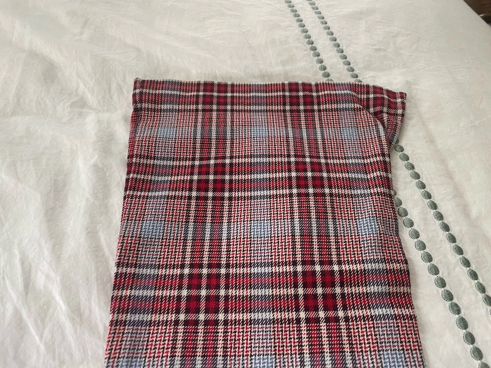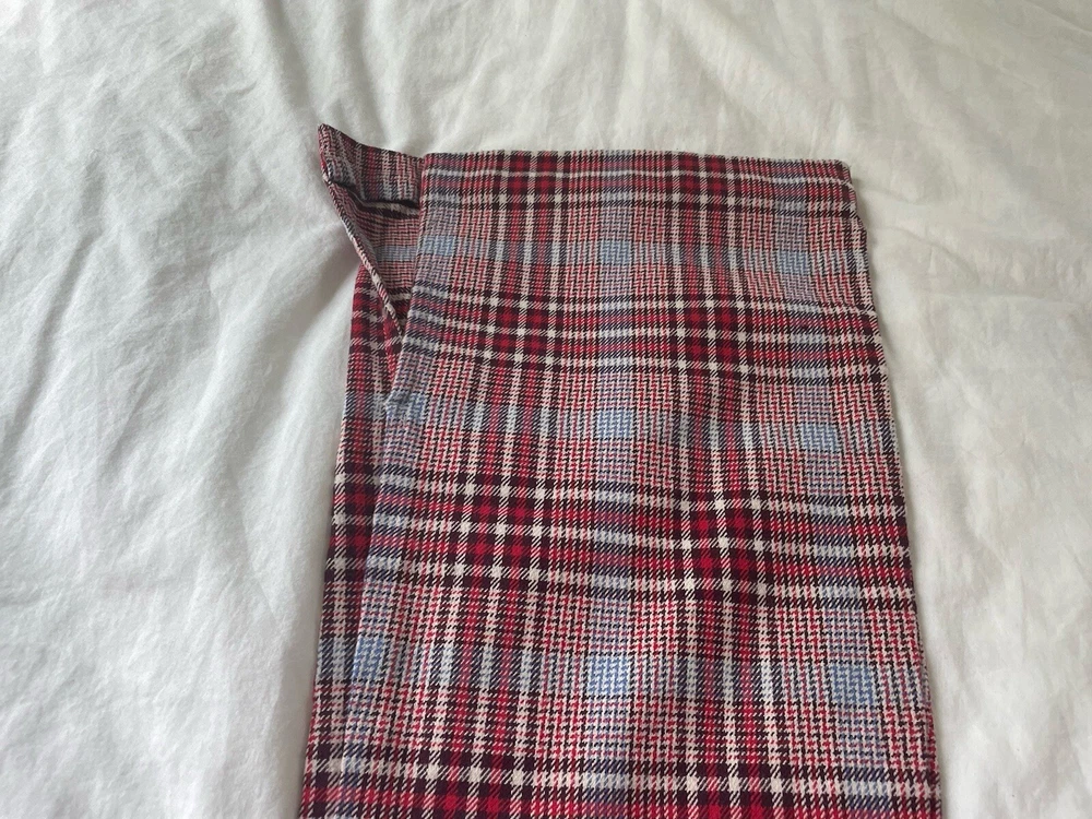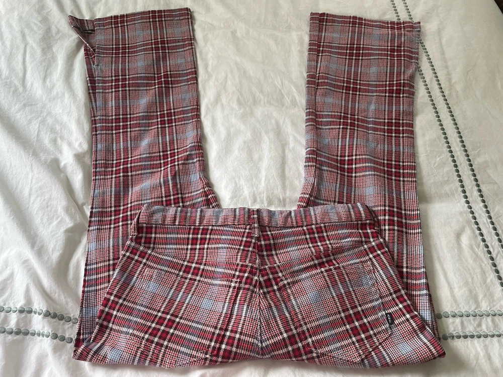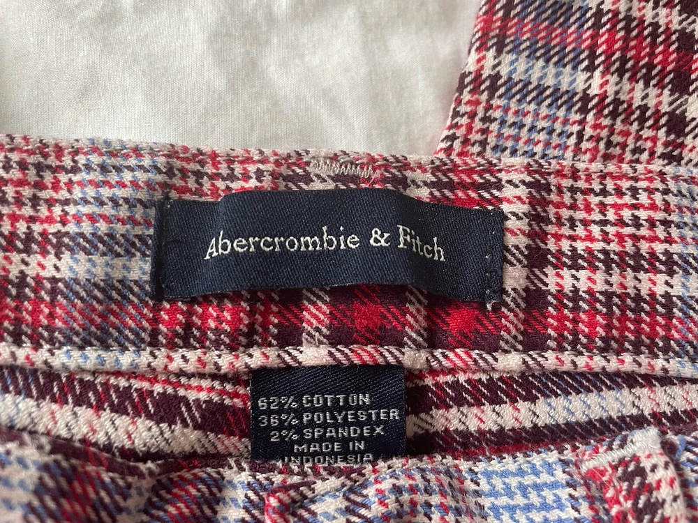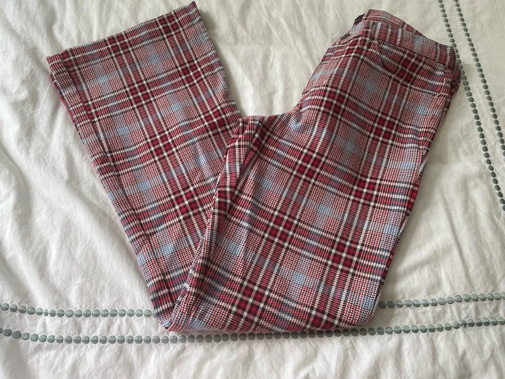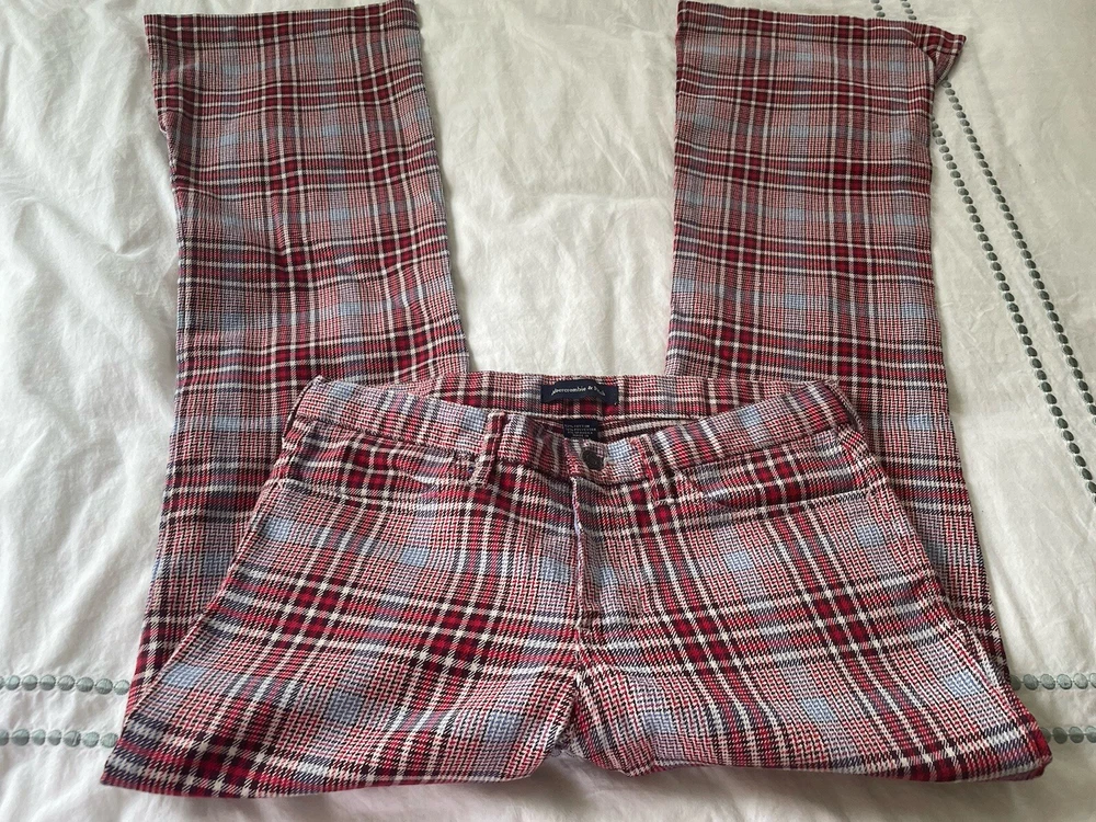 Abercrombie & Fitch plaid bell bottoms pants. Size 4. Waistband with belt loops. Flat front with zipper and button closure. Front pockets. Hip pockets. Logo. Bell bottom legs are vented at hem. Cotton polyester and spandex. Machine wash. Excellent condition. Waist 31 inches Stride 9 inches Inseam 30 inches