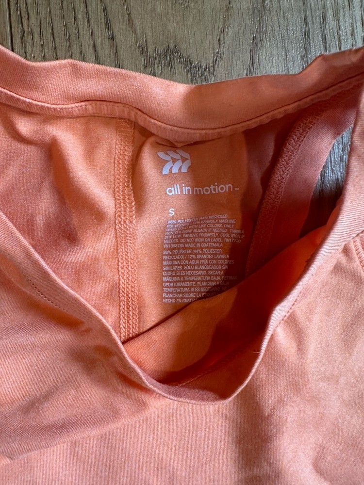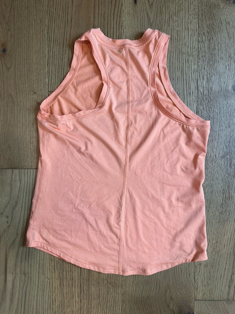 Women’s all in motion hi neck muscle orange tank shirt Size small Measurements armpit to armpit ( laying flat one side ) 16.5 inches length ( long pointing curved hem) 24 inches Material 88% polyester (44% recycled polyester / 12% spandex Message with any questions Smoke free environment