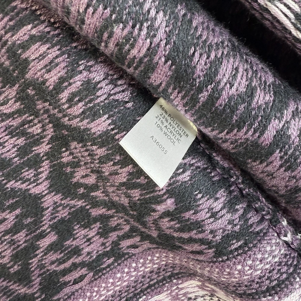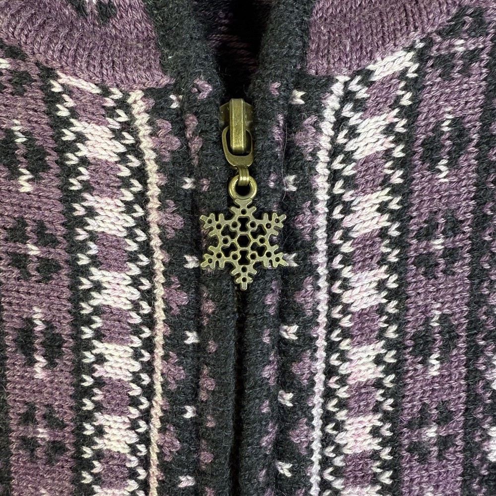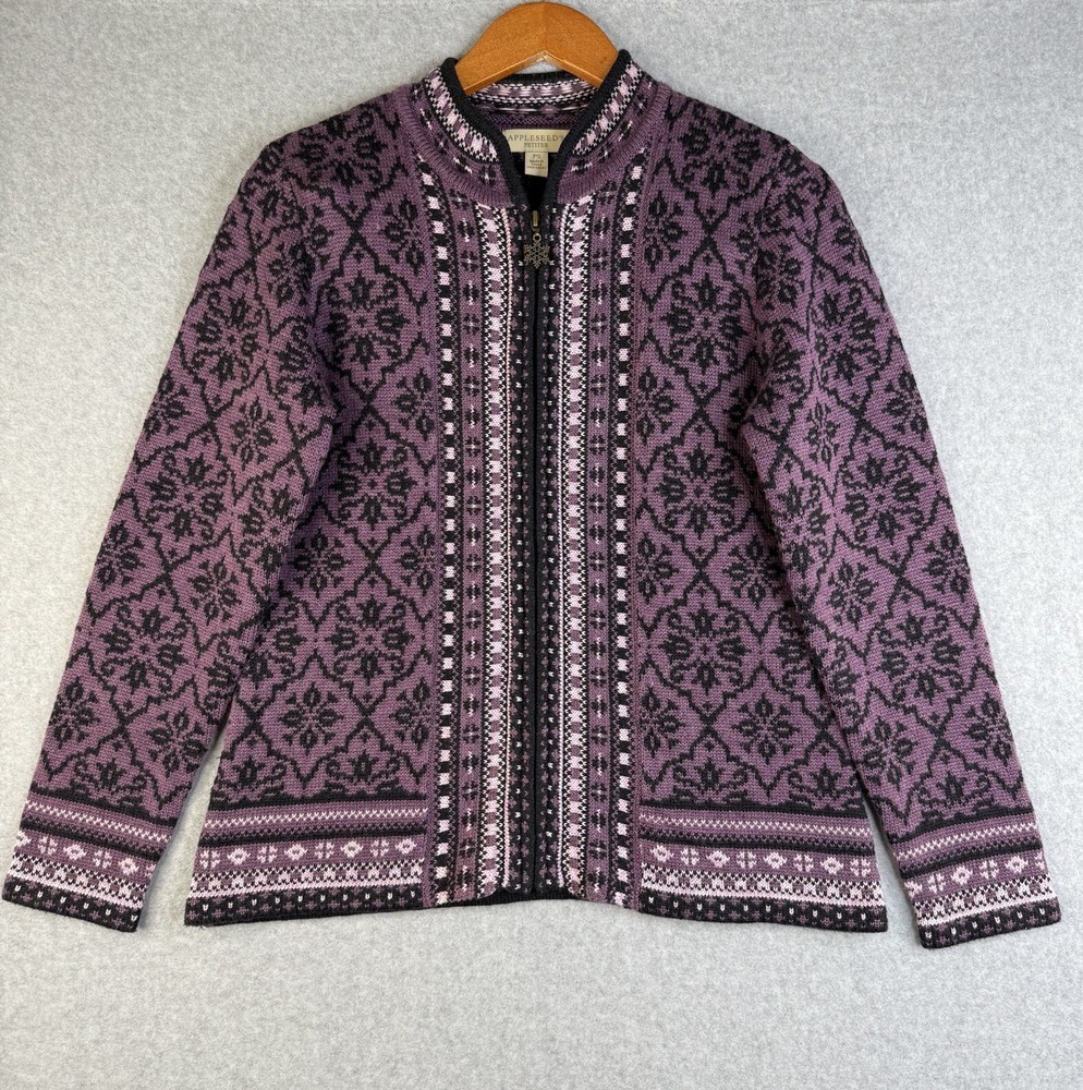 Women's Appleseed's Purple Full Zip Fair Isle Long Sleeve Cardigan Sweater PS. Made out of nylon, acrylic and, wool. In excellent pre-worn condition. View approximate measurements below. Pit to pit 19" Length 24" Sleeve 24" Shoulder to shoulder 16" SKU F22