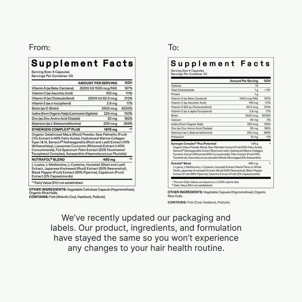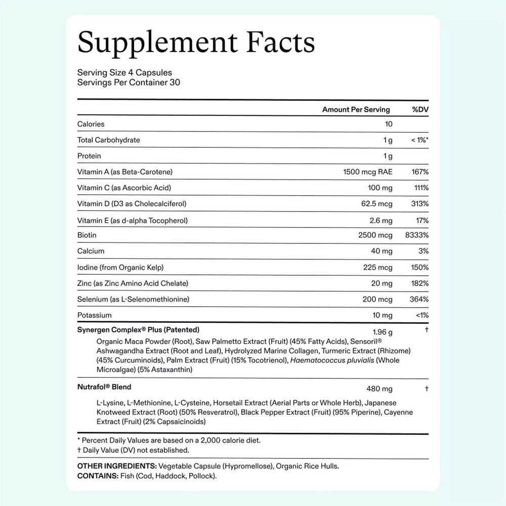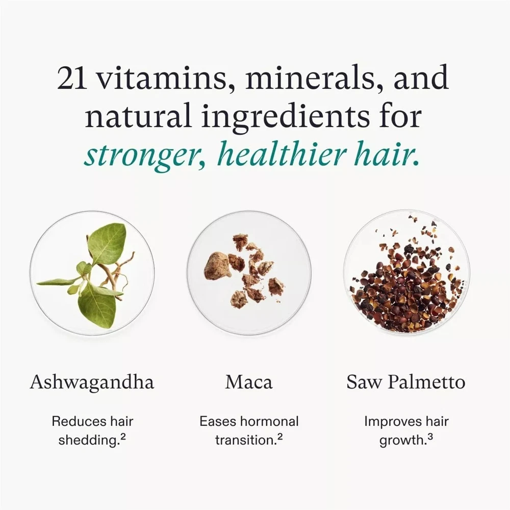1-MONTH SUPPLY: One (1) bottle of Women's Balance Hair Growth Supplements for visibly thicker, fuller, stronger hair to support women through and beyond menopause FOR WOMEN AGES 45 AND UP: Physician-formulated supplement that improves hair growth for women ages 45 and older by targeting 6 root causes of thinning hair including hormone shifts, aging and menopause changes RESULTS IN 3-6 MONTHS: Take 4 capsules once daily for visible results. In a clinical study, 93% of women felt their hair looked healthier after 6 months and 100% showed improved hair growth after 9 months SCIENCE-BACKED INGREDIENTS: Featuring a proprietary blend of 21 vitamins, minerals, and natural ingredients, including Maca, Ashwagandha and Saw Palmetto