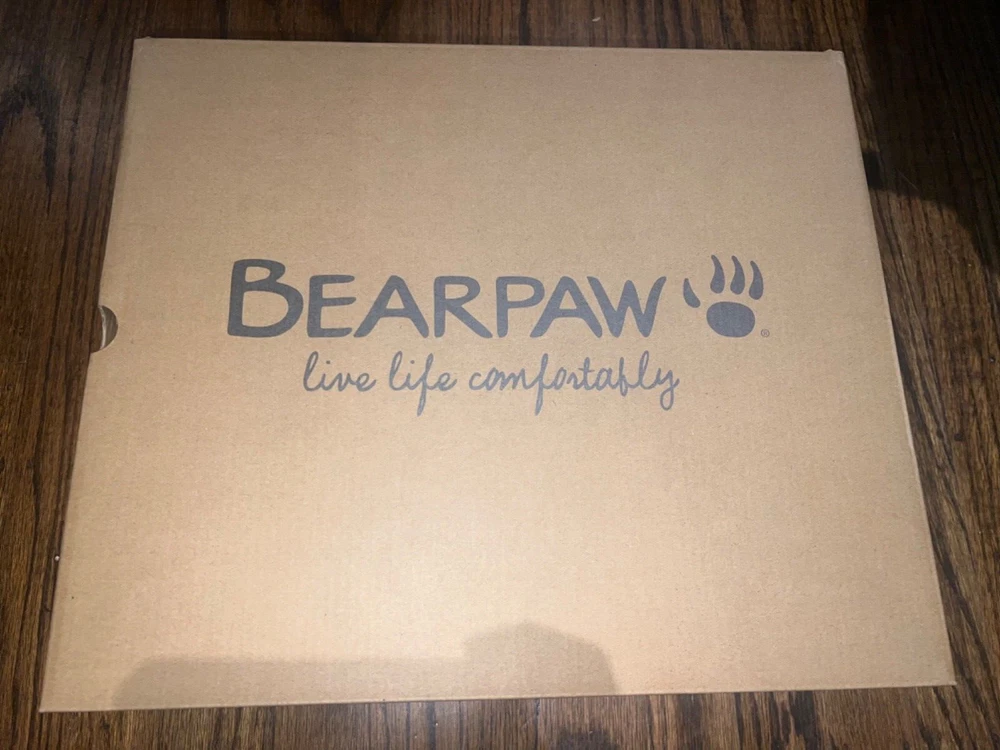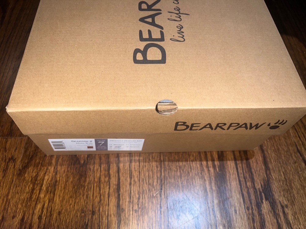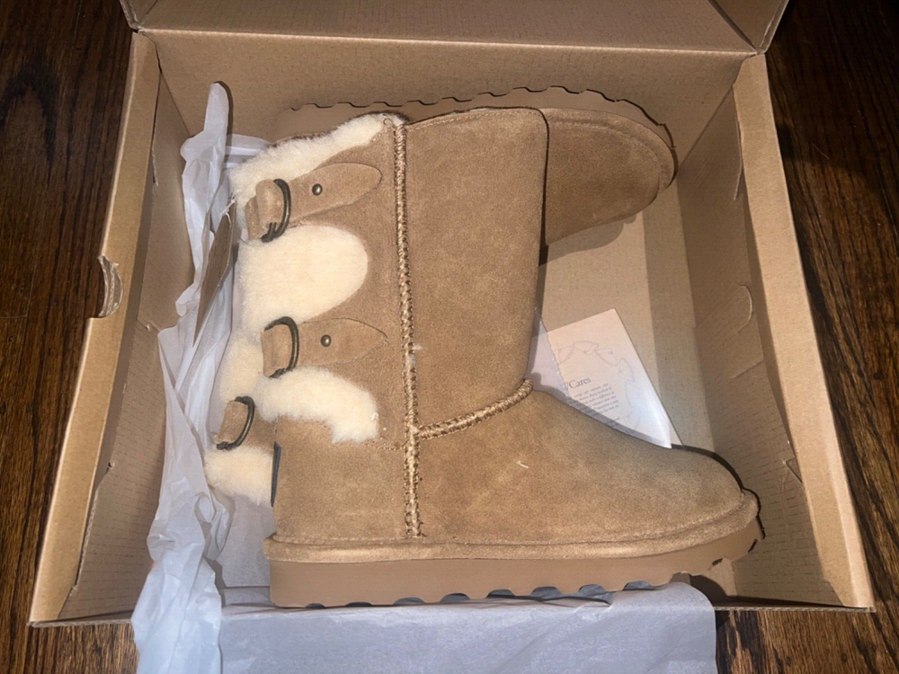 Brand new in original box! Size: Women's Size 7 Wide Width Color: Hickory/Champagne Double d-ring straps cinch the back of this smart suede boot on BearPaw's new slimmer design construction with fuzzy faux fur or wool blend accented back panel. Treated with BearCoat™ Rain & Stain Repellent. Features: -Suede, faux fur upper -Decorate buckle details -Pull-on, Buckle -Wool blend lining -Comfort sheepskin footbed -Lightweight blown rubber outsole -Treated with BearCoat™ Rain & Stain Repellent -8" shaft height -13" circumference