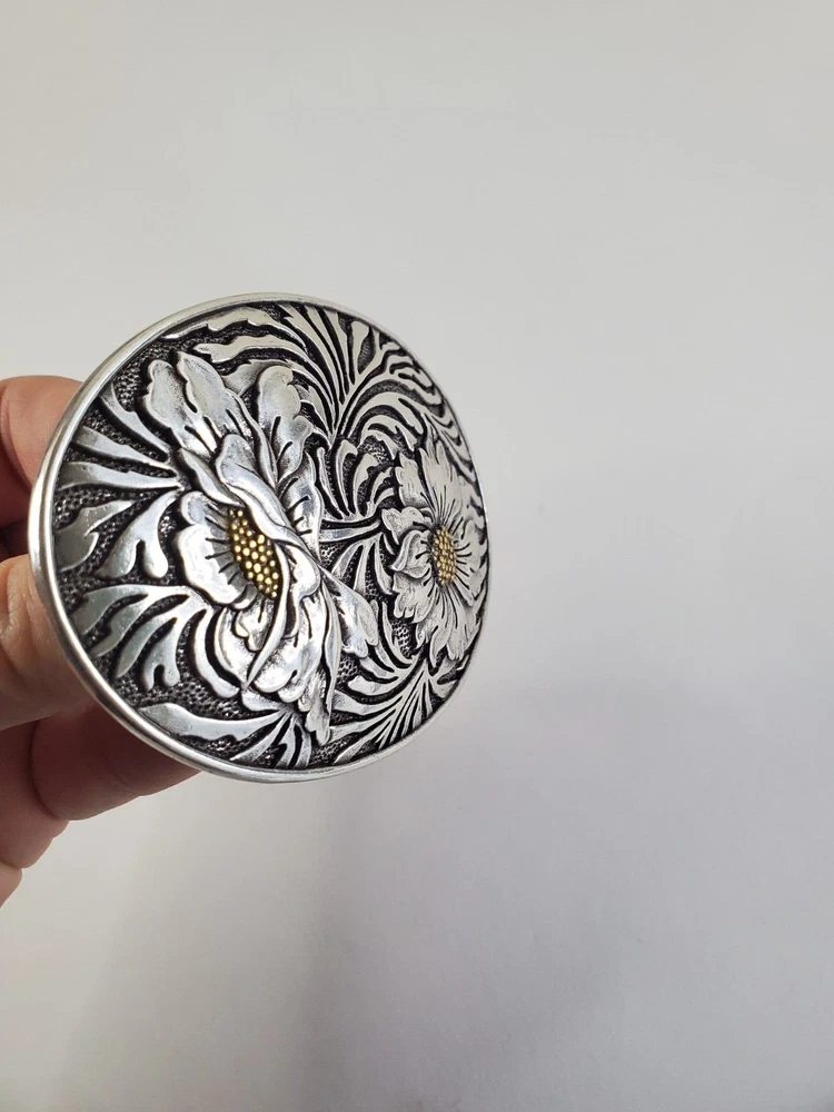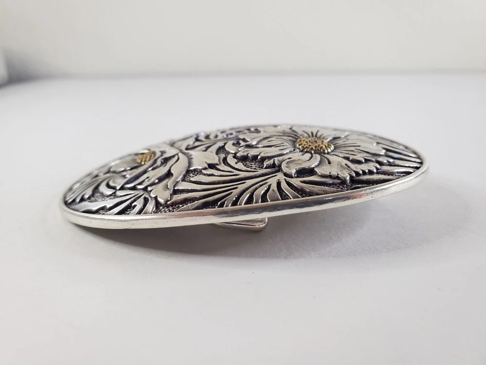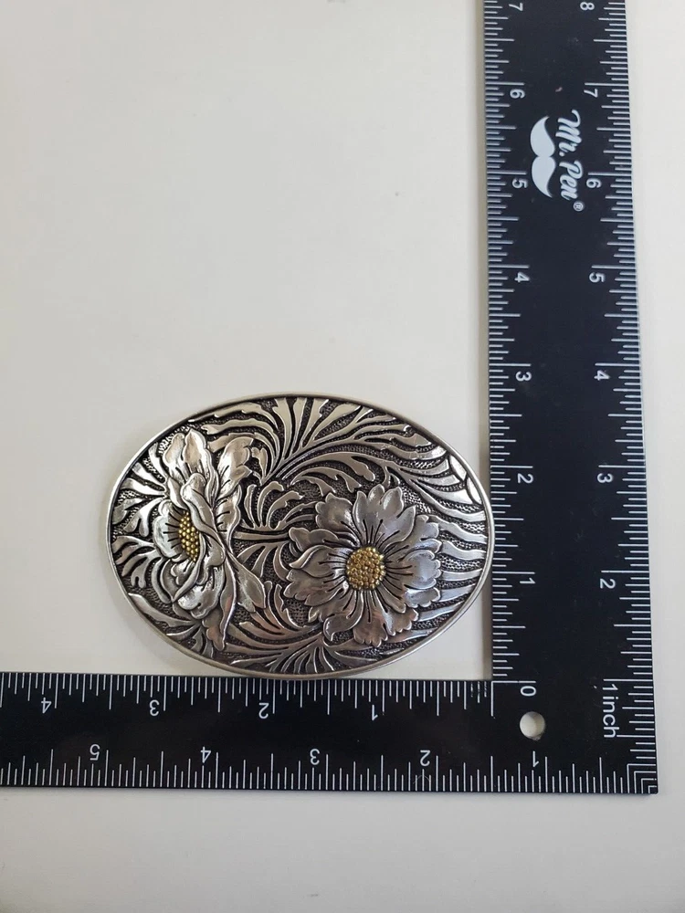 This belt buckle is in excellent condition, new without tags, never been worn. 3.5" Length x 2.75" Height. It has a slight curvature to it. It is a pewter material with a brushed nickle-type finish. The center of the flowers are gold-toned. Please let me know if you have any questions.