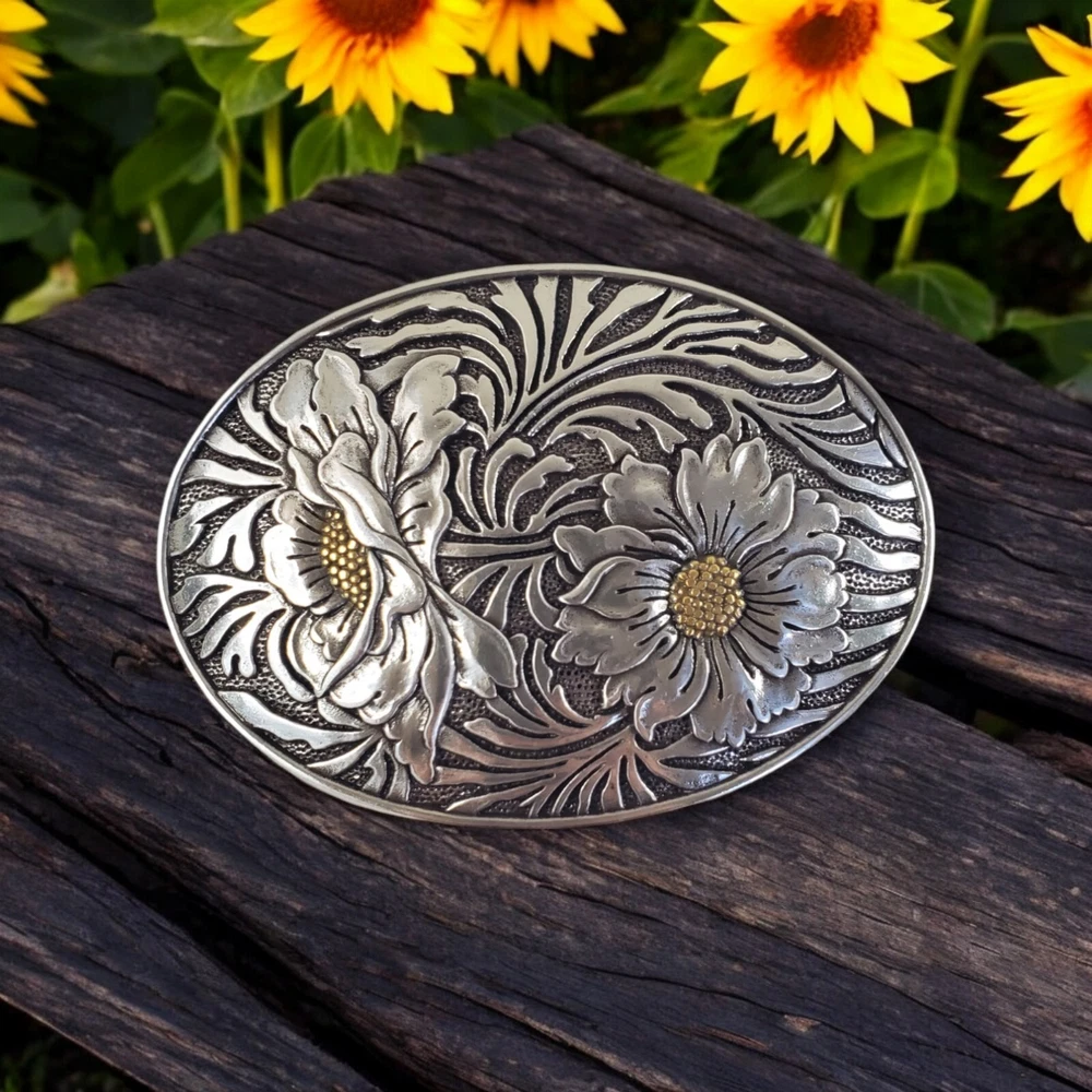 Women's Belt Buckle Oval Flowers Pewter Gold Western Cowgirl